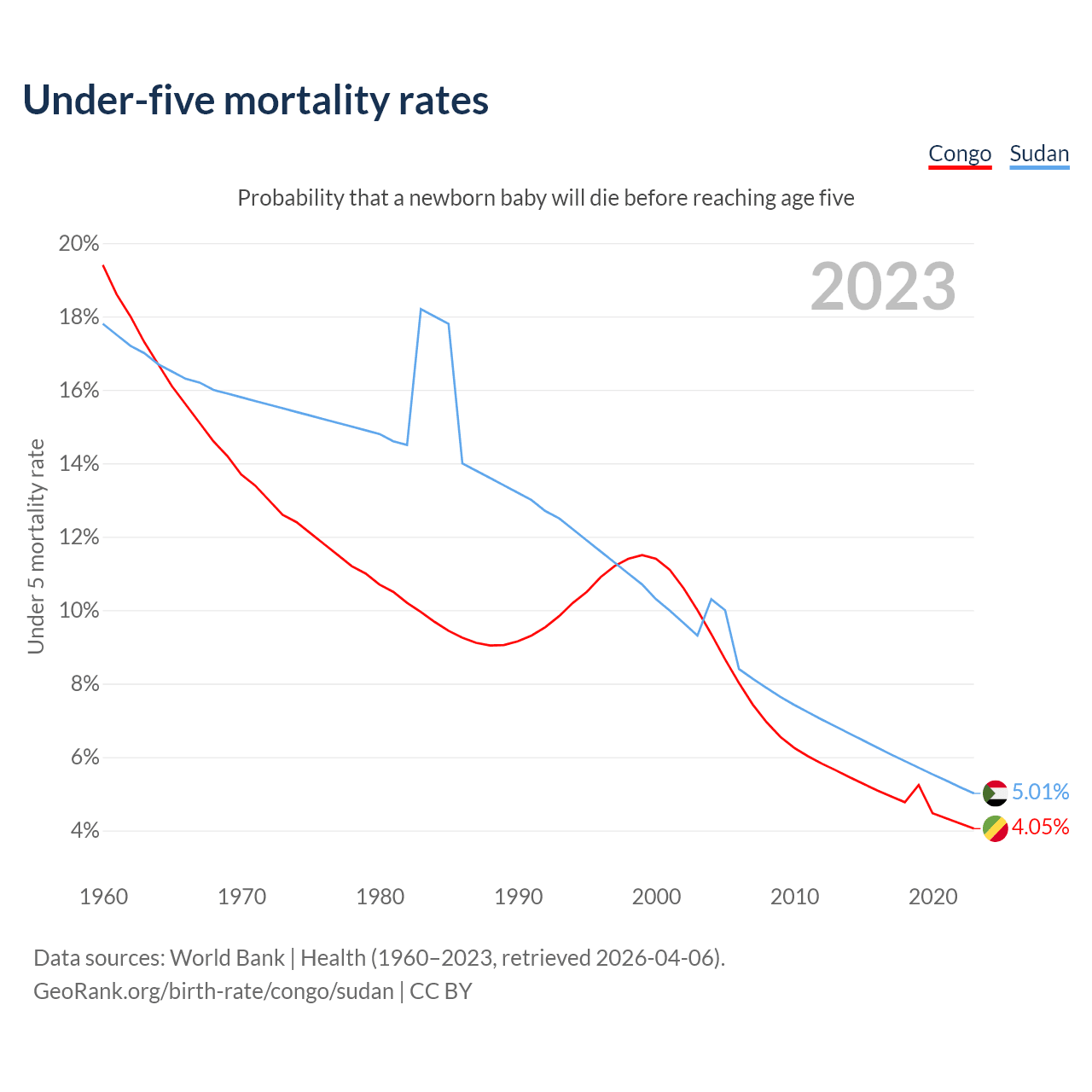 The chance that a newborn baby will die before reaching age five is 4.05% in the Congo and 5.01% in Sudan. Above is a chart with historical data on under-five mortality rates.
