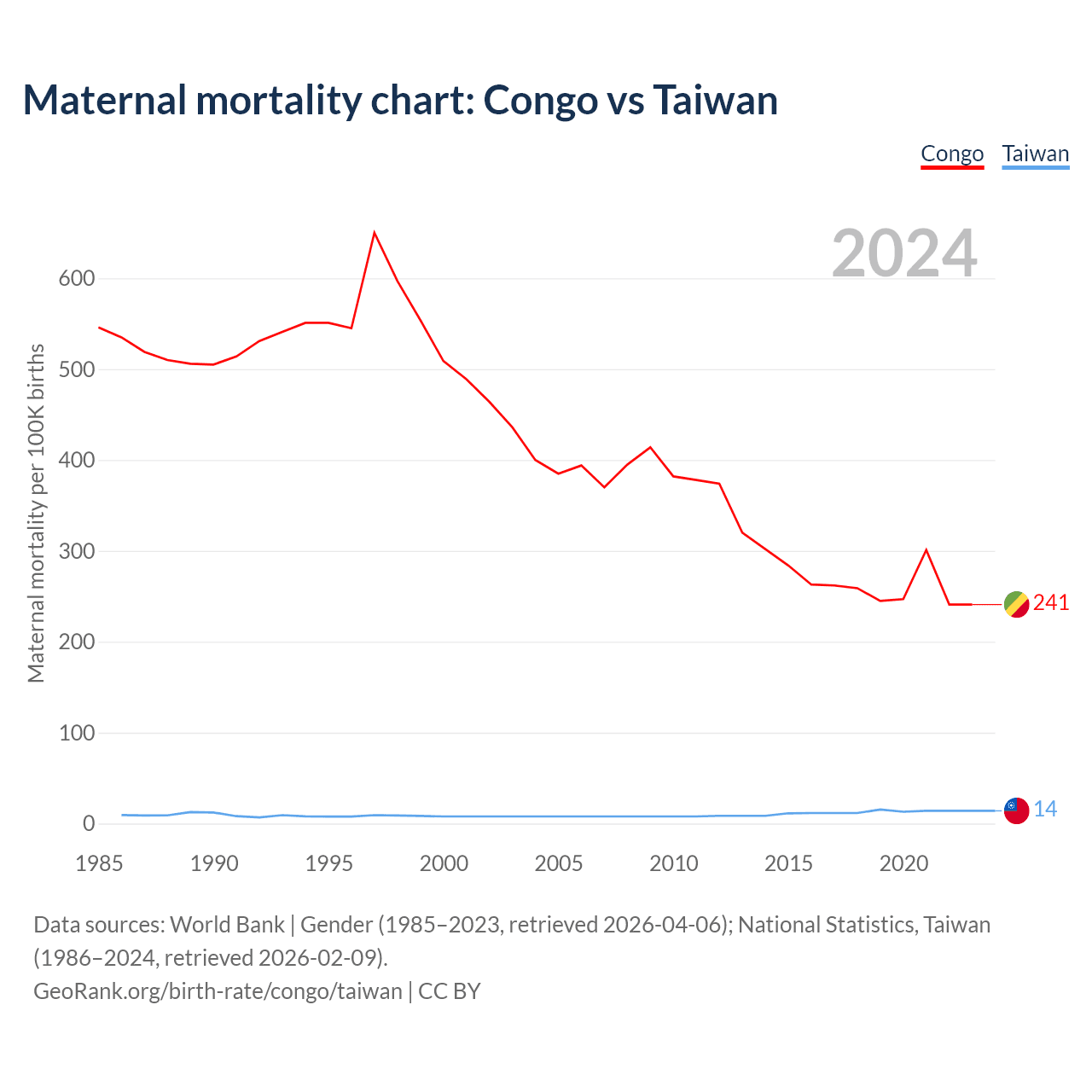 The maternal mortality rate, which is the probability of dying during childbirth or within 42 days of pregnancy termination, is 241 deaths per 100,000 live births in the Congo, compared to 14 deaths in Taiwan.