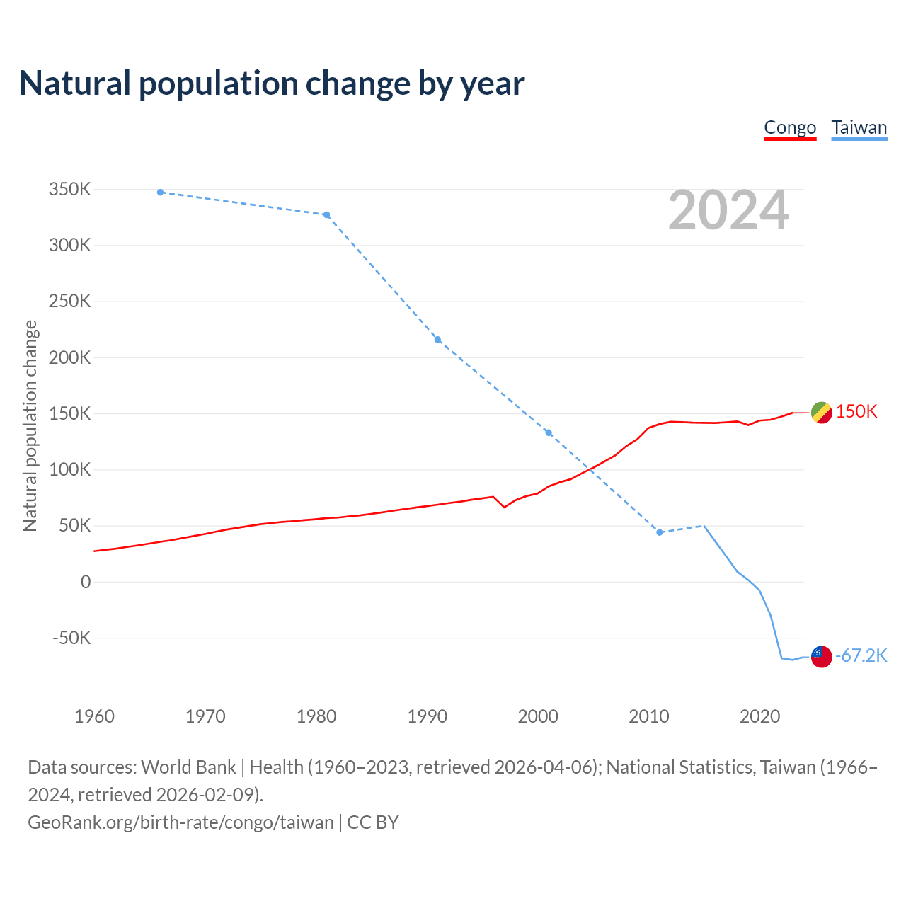 The Congo has an annual birth rate of 30.6 births per 1,000 people, compared to 5.76 for Taiwan. The average number of children a woman is expected to have during her lifetime — the fertility rate, is 4.16 in the Congo and 0.89 in Taiwan — 78.7% difference.
