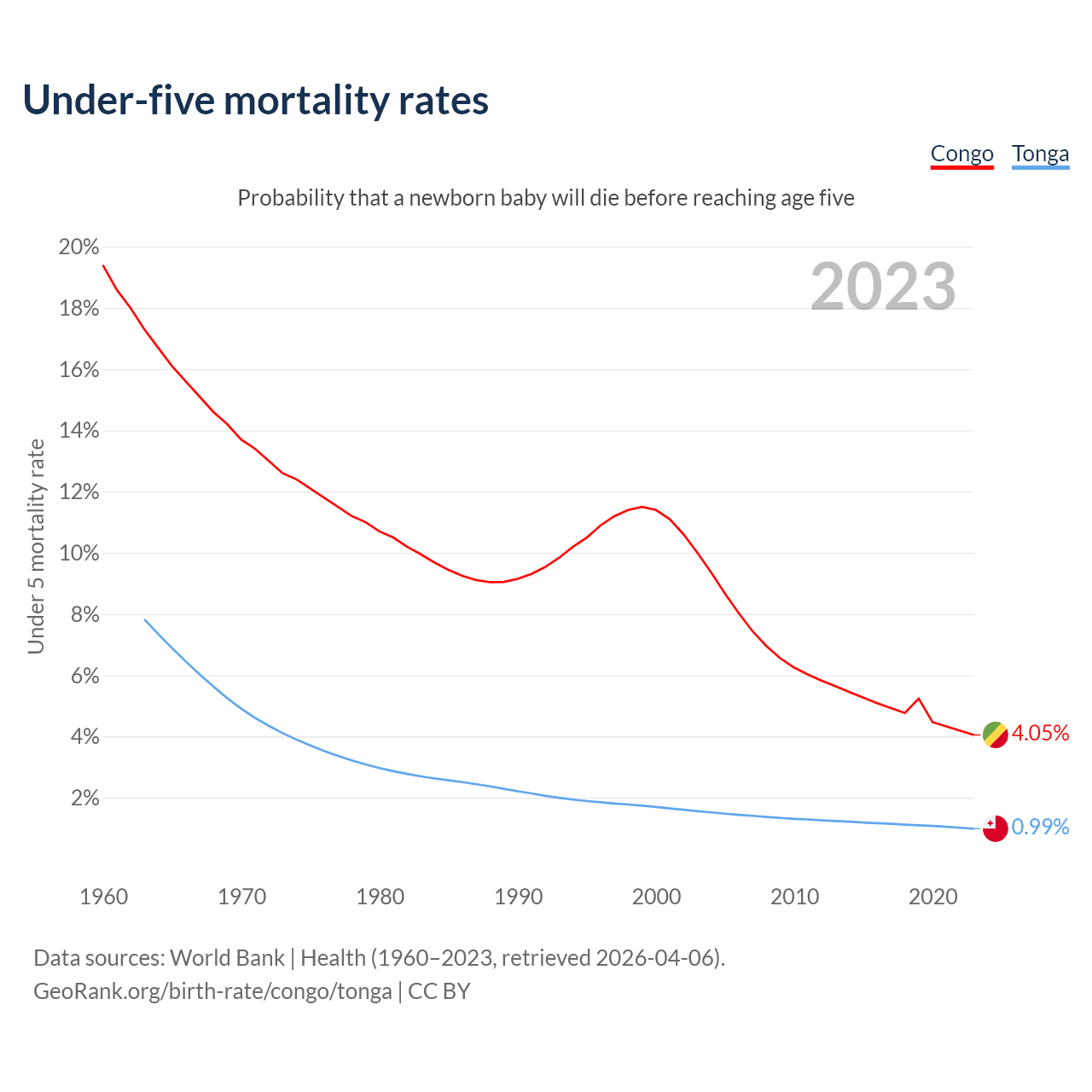 The chance that a newborn baby will die before reaching age five is 4.05% in the Congo and 0.99% in Tonga. Above is a chart with historical data on under-five mortality rates.