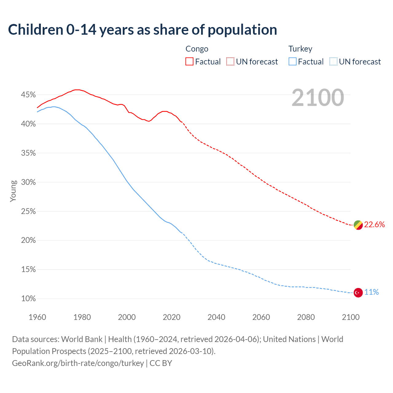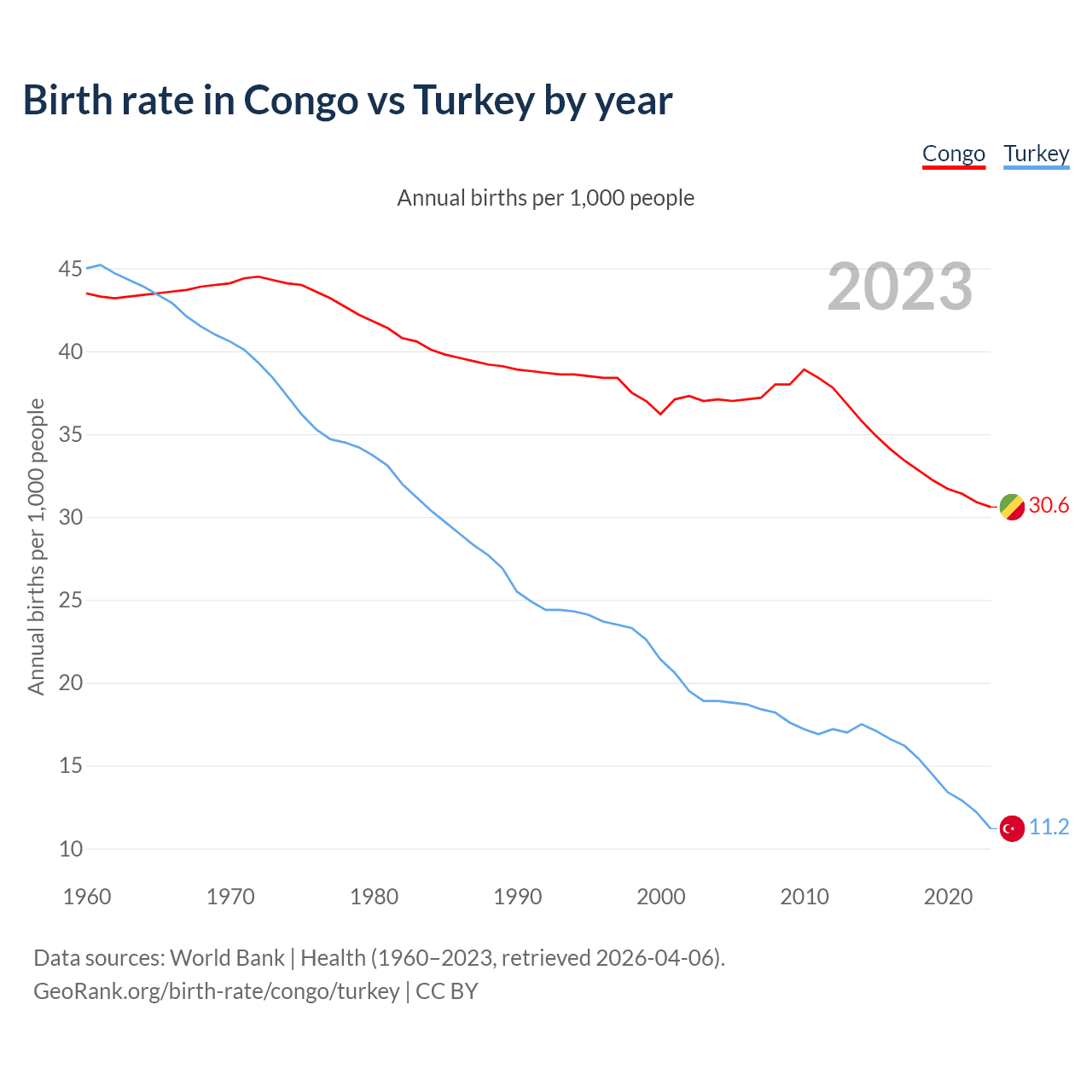The Congo has an annual birth rate of 30.6 births per 1,000 people, compared to 11.2 for Turkey. The average number of children a woman is expected to have during her lifetime — the fertility rate, is 4.16 in the Congo and 1.51 in Turkey — 63.7% difference.