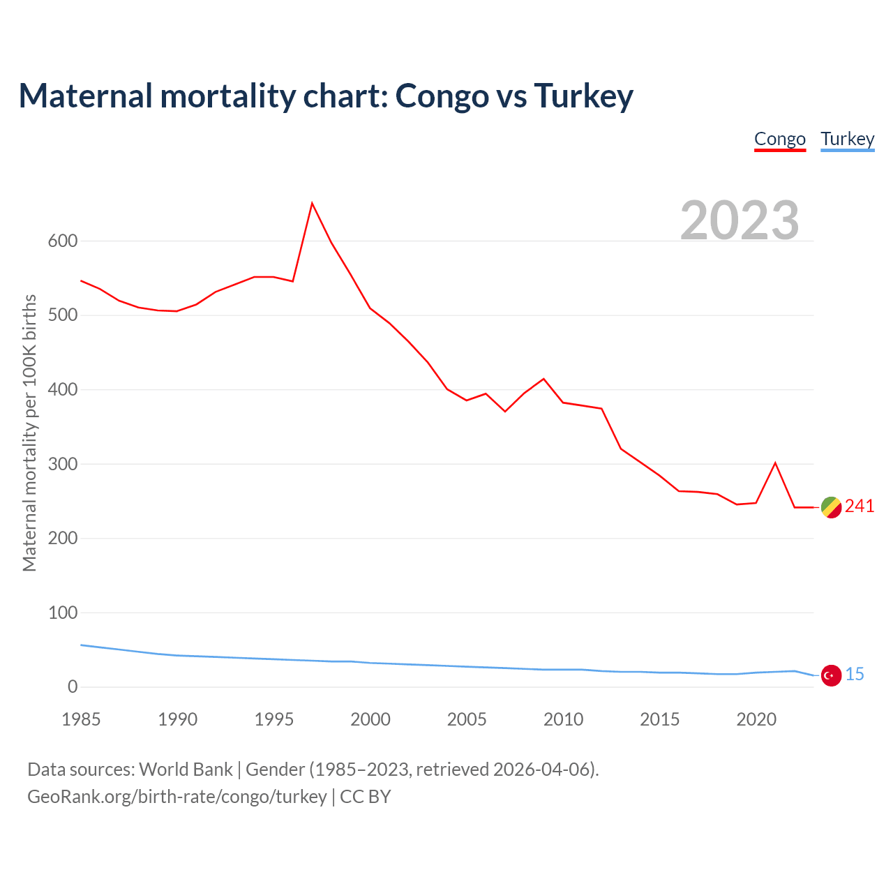 The maternal mortality rate, which is the probability of dying during childbirth or within 42 days of pregnancy termination, is 241 deaths per 100,000 live births in the Congo, compared to 15 deaths in Turkey.