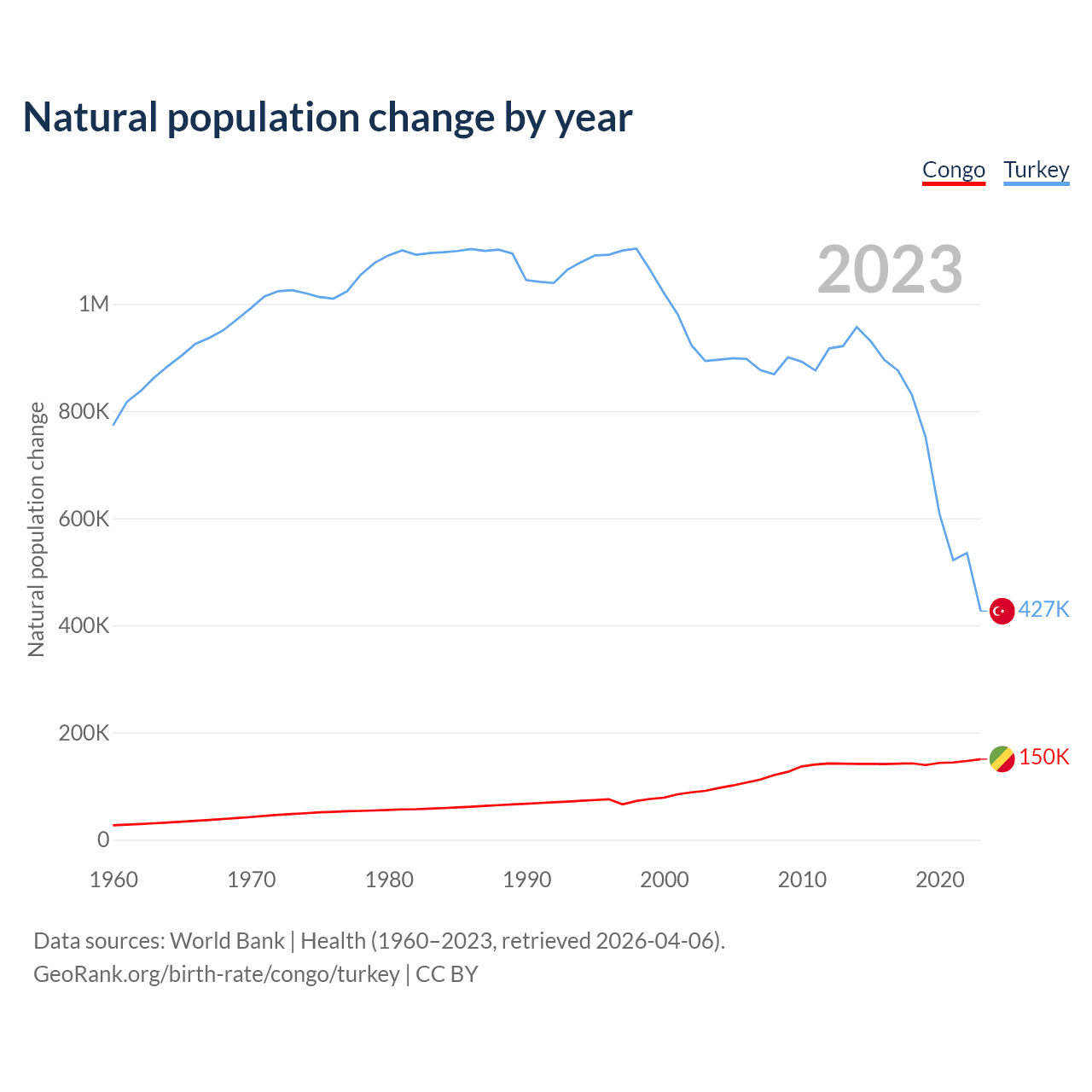 According to the latest available data on birth rates, the fertility rate in the Congo was 4.16 children per woman in 2023, compared to 1.51 in Turkey in 2023. The replacement level is considered to be 2.1 children per woman.