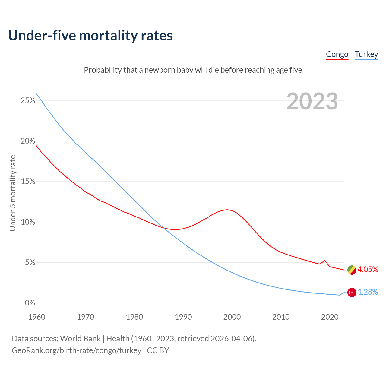 The chance that a newborn baby will die before reaching age five is 4.05% in the Congo and 1.28% in Turkey. Above is a chart with historical data on under-five mortality rates.