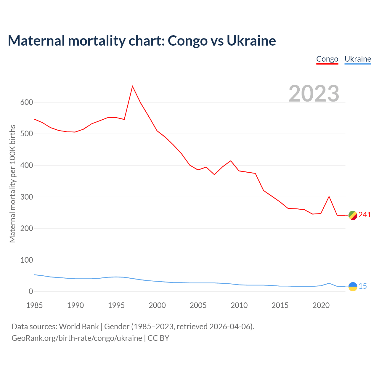 The maternal mortality rate, which is the probability of dying during childbirth or within 42 days of pregnancy termination, is 241 deaths per 100,000 live births in the Congo, compared to 15 deaths in Ukraine.
