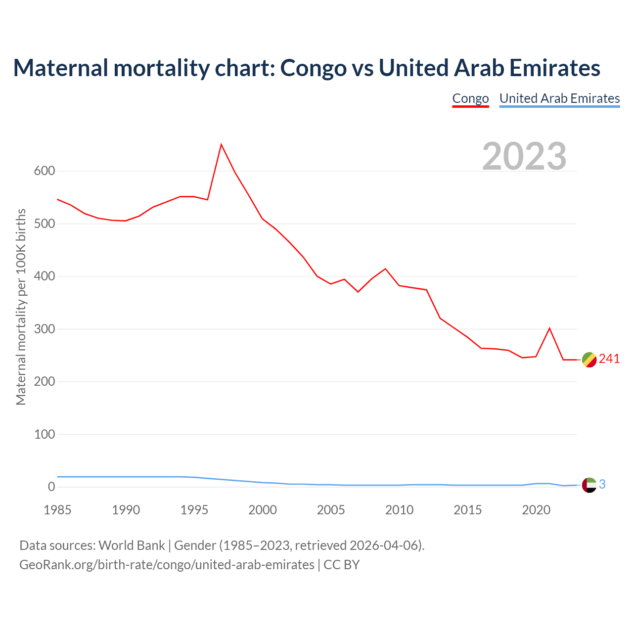 The maternal mortality rate, which is the probability of dying during childbirth or within 42 days of pregnancy termination, is 241 deaths per 100,000 live births in the Congo, compared to 3 deaths in the United Arab Emirates.