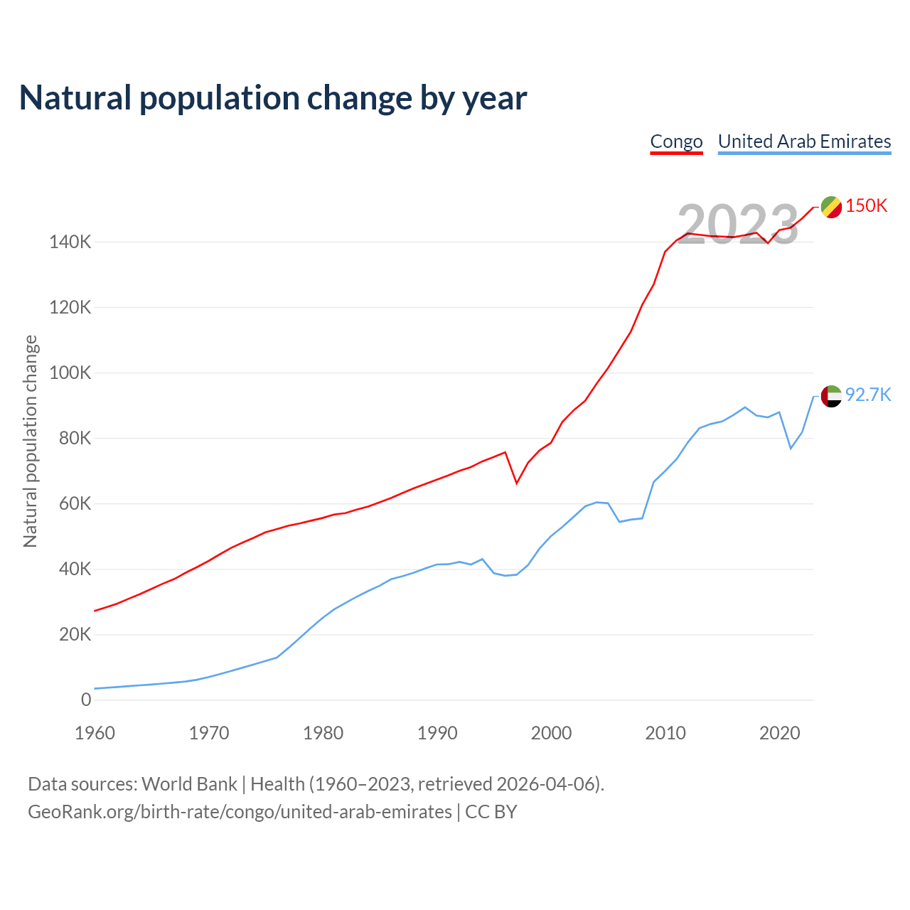 The Congo has an annual birth rate of 30.6 births per 1,000 people, compared to 9.77 for the United Arab Emirates. The average number of children a woman is expected to have during her lifetime — the fertility rate, is 4.16 in the Congo and 1.2 in the United Arab Emirates — 71.1% difference.