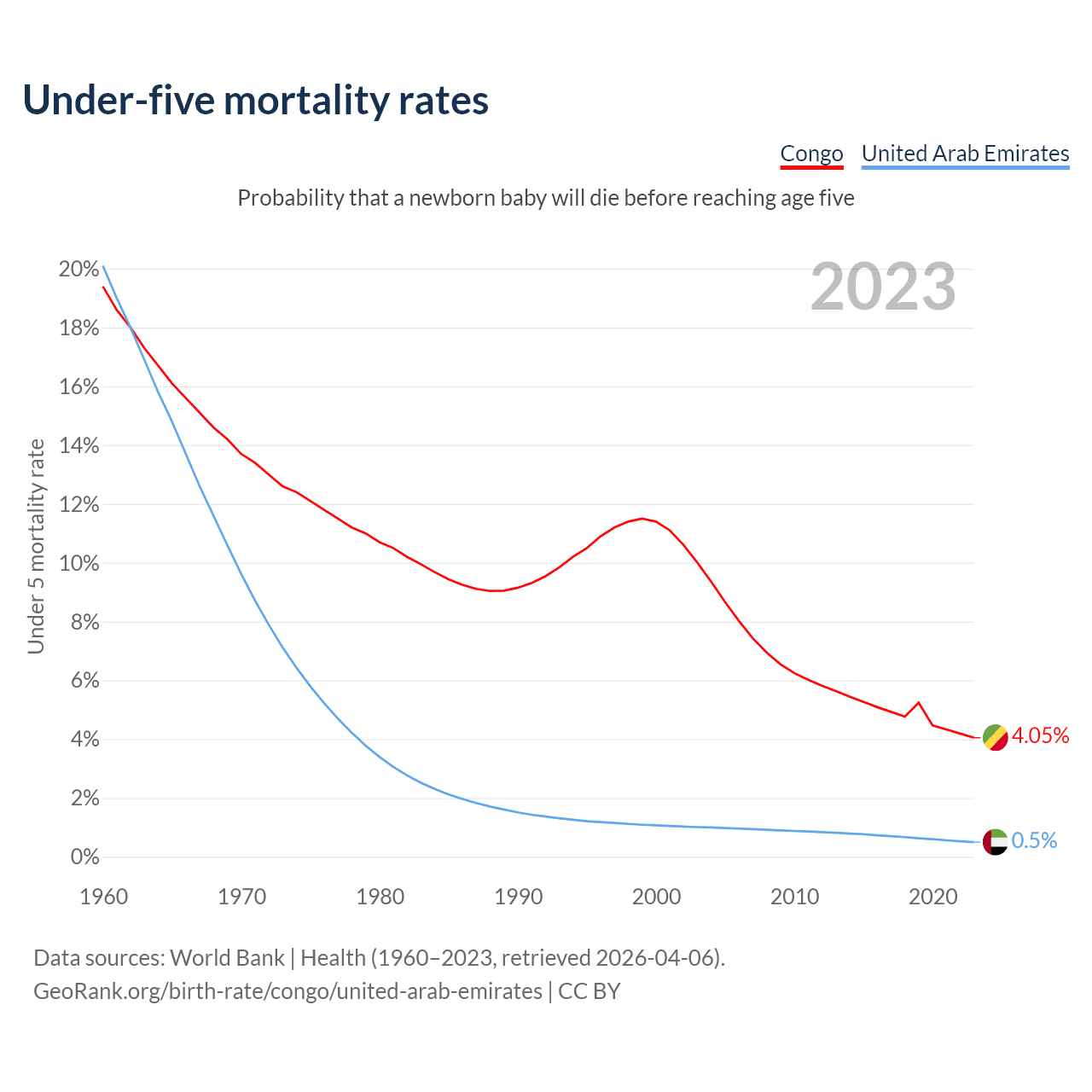 The chance that a newborn baby will die before reaching age five is 4.05% in the Congo and 0.5% in the United Arab Emirates. Above is a chart with historical data on under-five mortality rates.