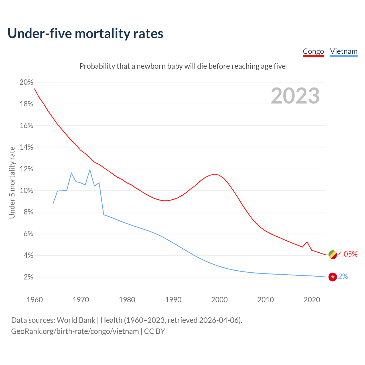 The chance that a newborn baby will die before reaching age five is 4.05% in the Congo and 2% in Vietnam. Above is a chart with historical data on under-five mortality rates.