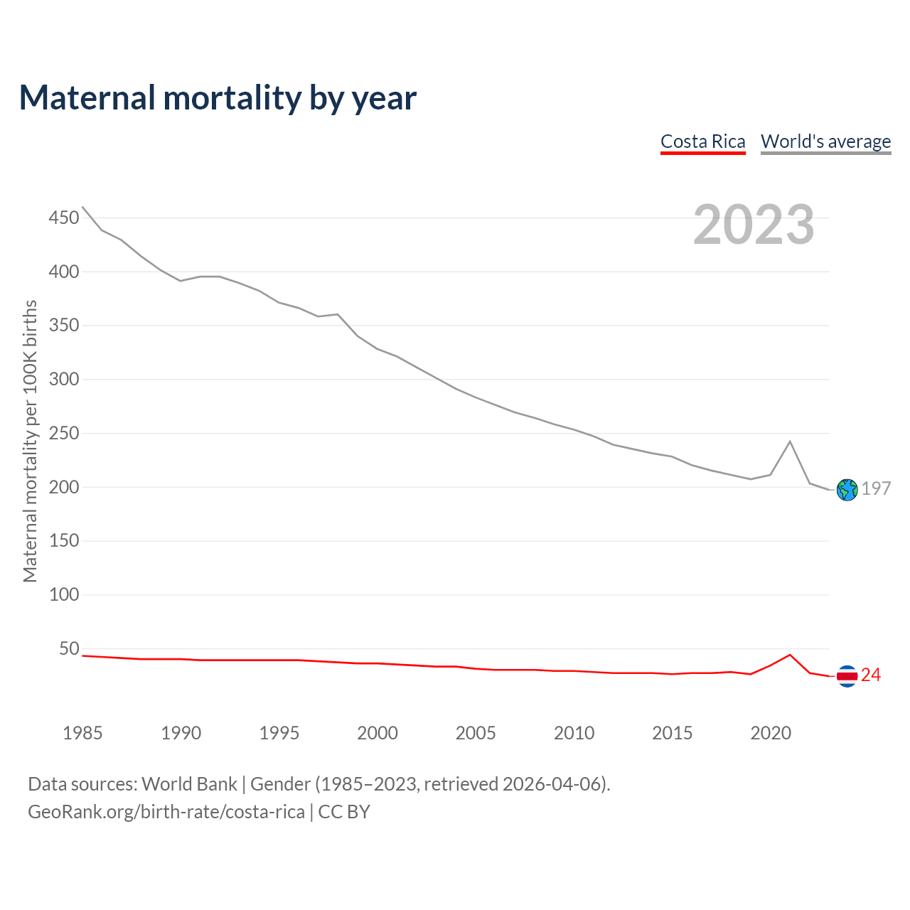 The maternal mortality rate in Costa Rica was 24 deaths per 100,000 live births in 2023 — a 0.02% chance of dying during childbirth or within 42 days of pregnancy termination. This is a 33.3% decrease compared to the year 2000.