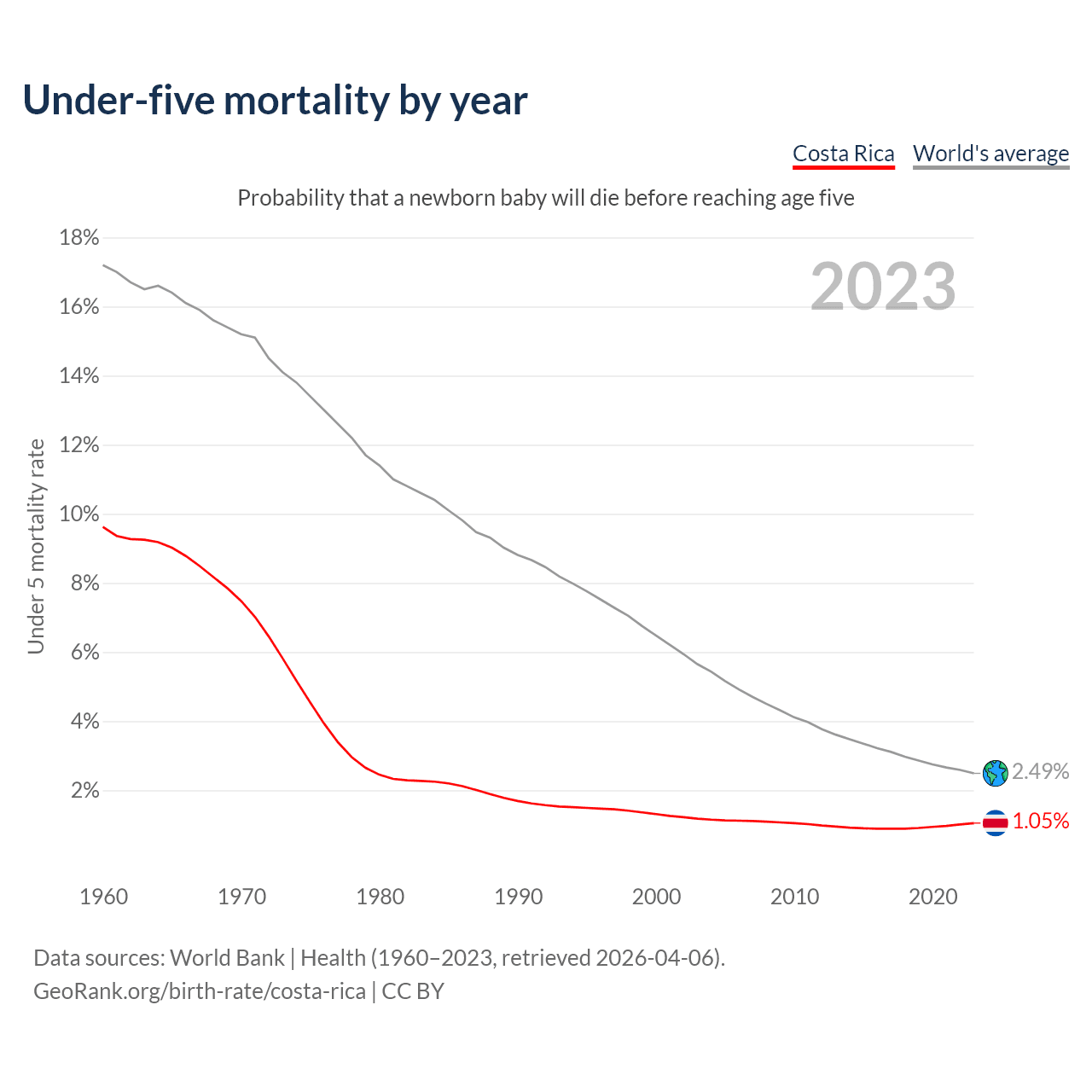 The under-5 mortality rate in Costa Rica was 10.5 deaths per 1,000 live births in 2023 — a 1.05% chance that a newborn baby will die before reaching age five. This is down from 13.1 deaths per 1,000 live births in 2000.