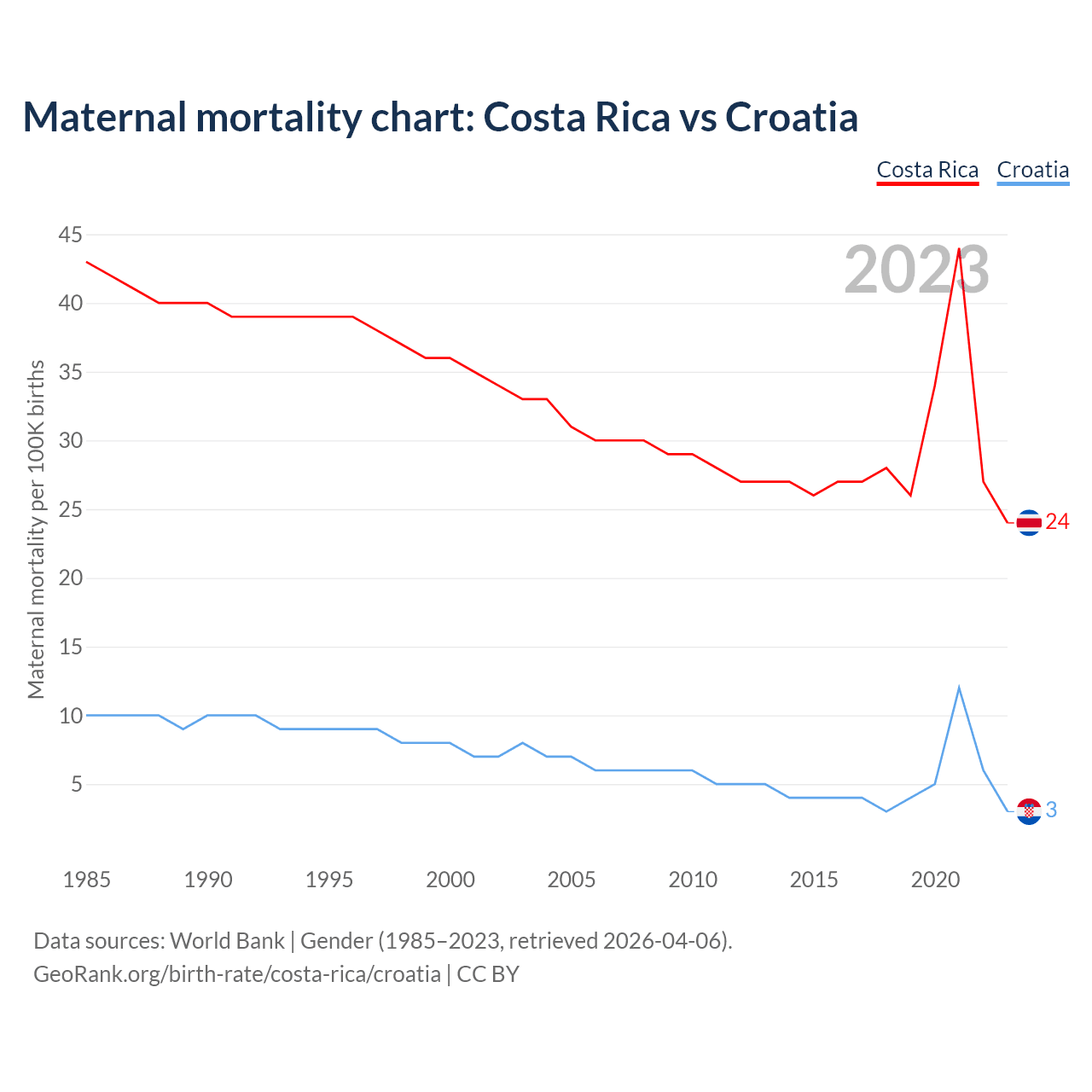 The maternal mortality rate, which is the probability of dying during childbirth or within 42 days of pregnancy termination, is 24 deaths per 100,000 live births in Costa Rica, compared to 3 deaths in Croatia.