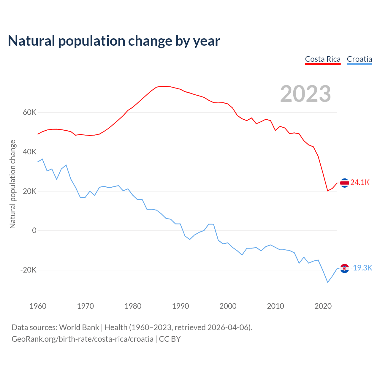 According to the latest available data on birth rates, the fertility rate in Costa Rica was 1.33 children per woman in 2023, compared to 1.46 in Croatia in 2023. The replacement level is considered to be 2.1 children per woman.