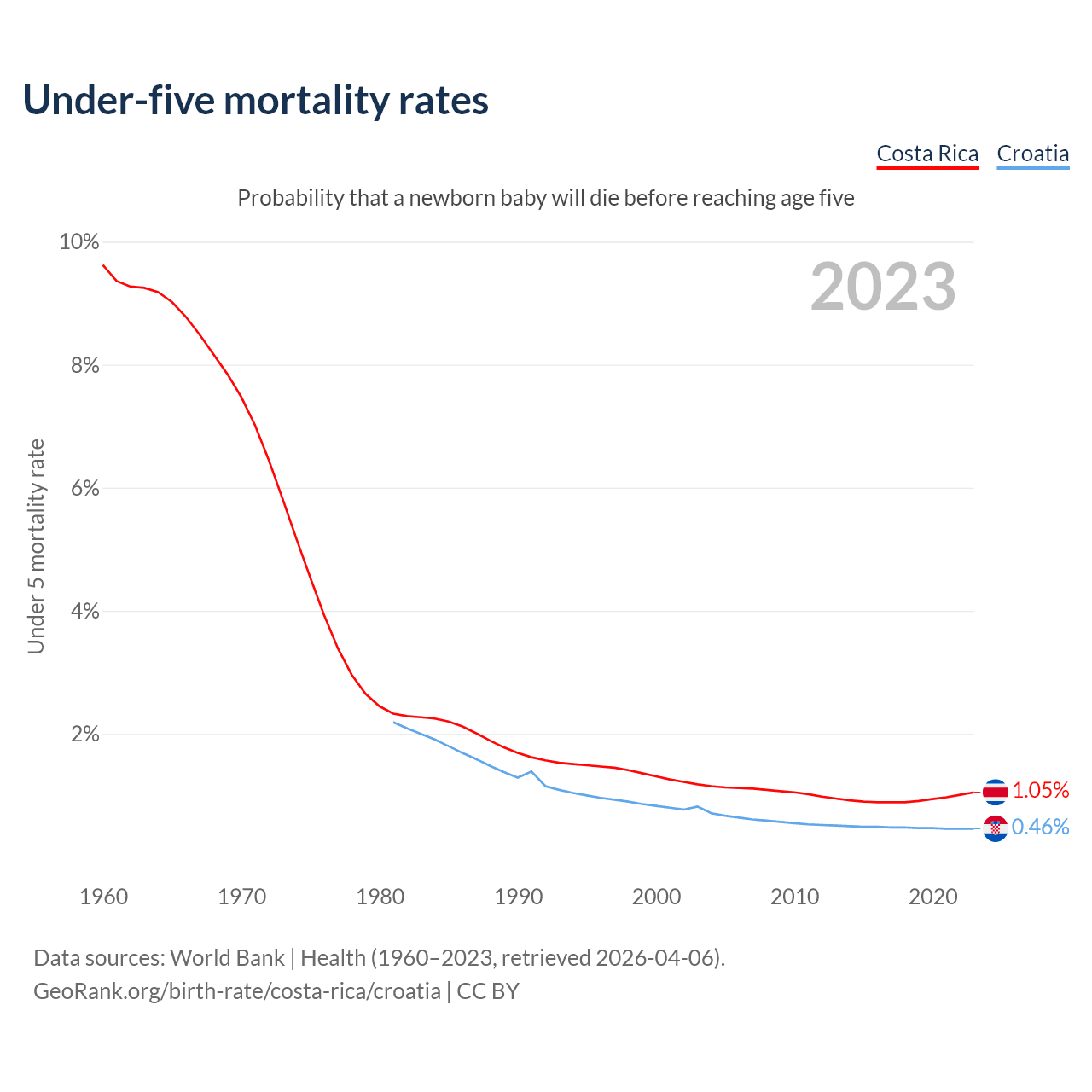 The chance that a newborn baby will die before reaching age five is 1.05% in Costa Rica and 0.46% in Croatia. Above is a chart with historical data on under-five mortality rates.