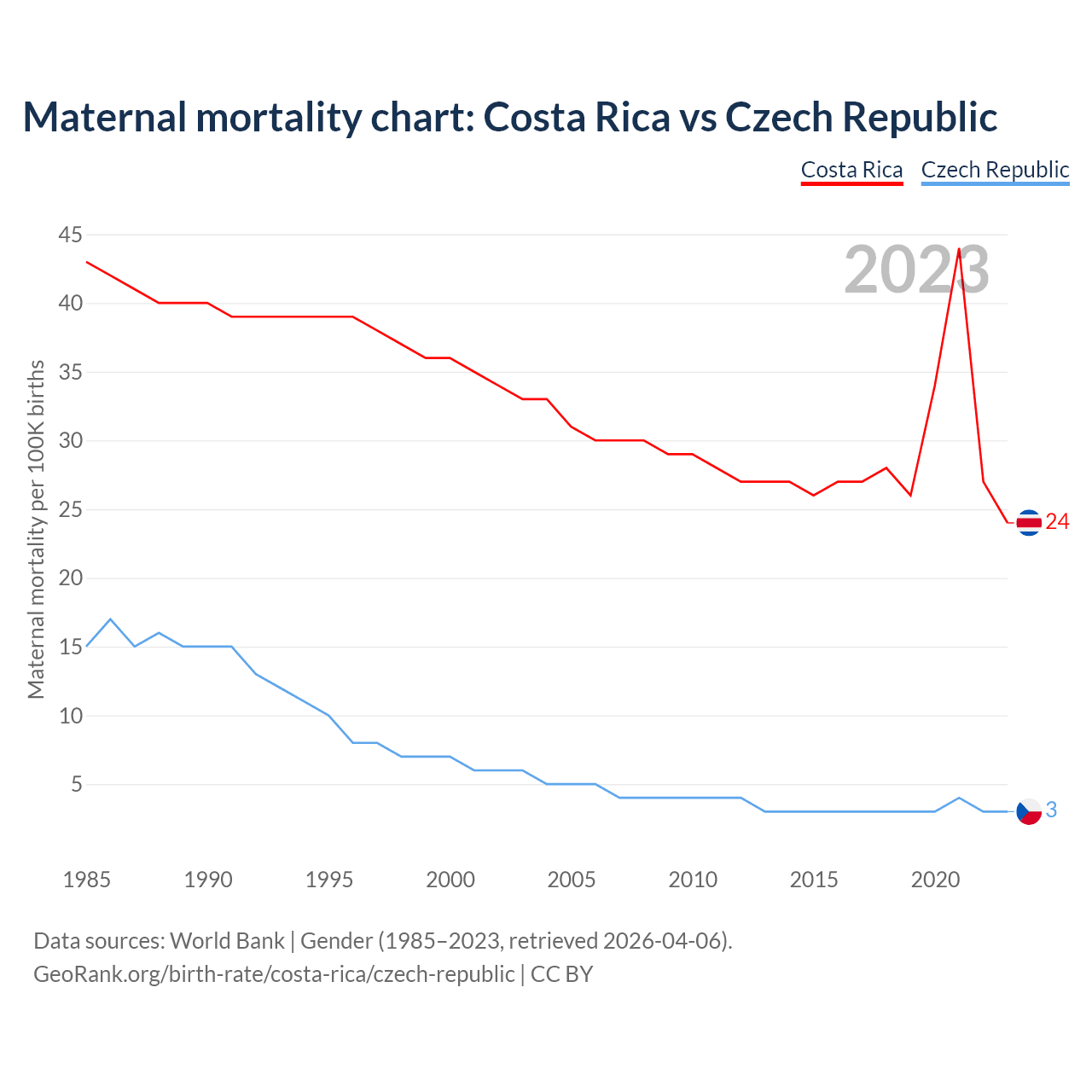 The maternal mortality rate, which is the probability of dying during childbirth or within 42 days of pregnancy termination, is 24 deaths per 100,000 live births in Costa Rica, compared to 3 deaths in the Czech Republic.