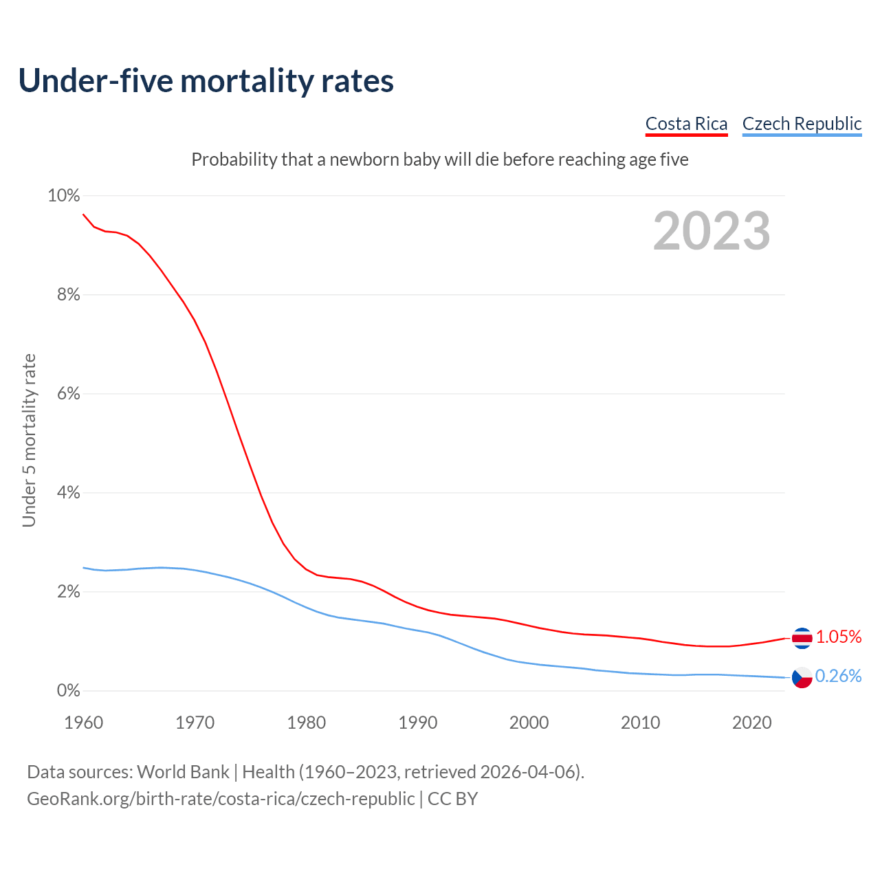 The chance that a newborn baby will die before reaching age five is 1.05% in Costa Rica and 0.26% in the Czech Republic. Above is a chart with historical data on under-five mortality rates.