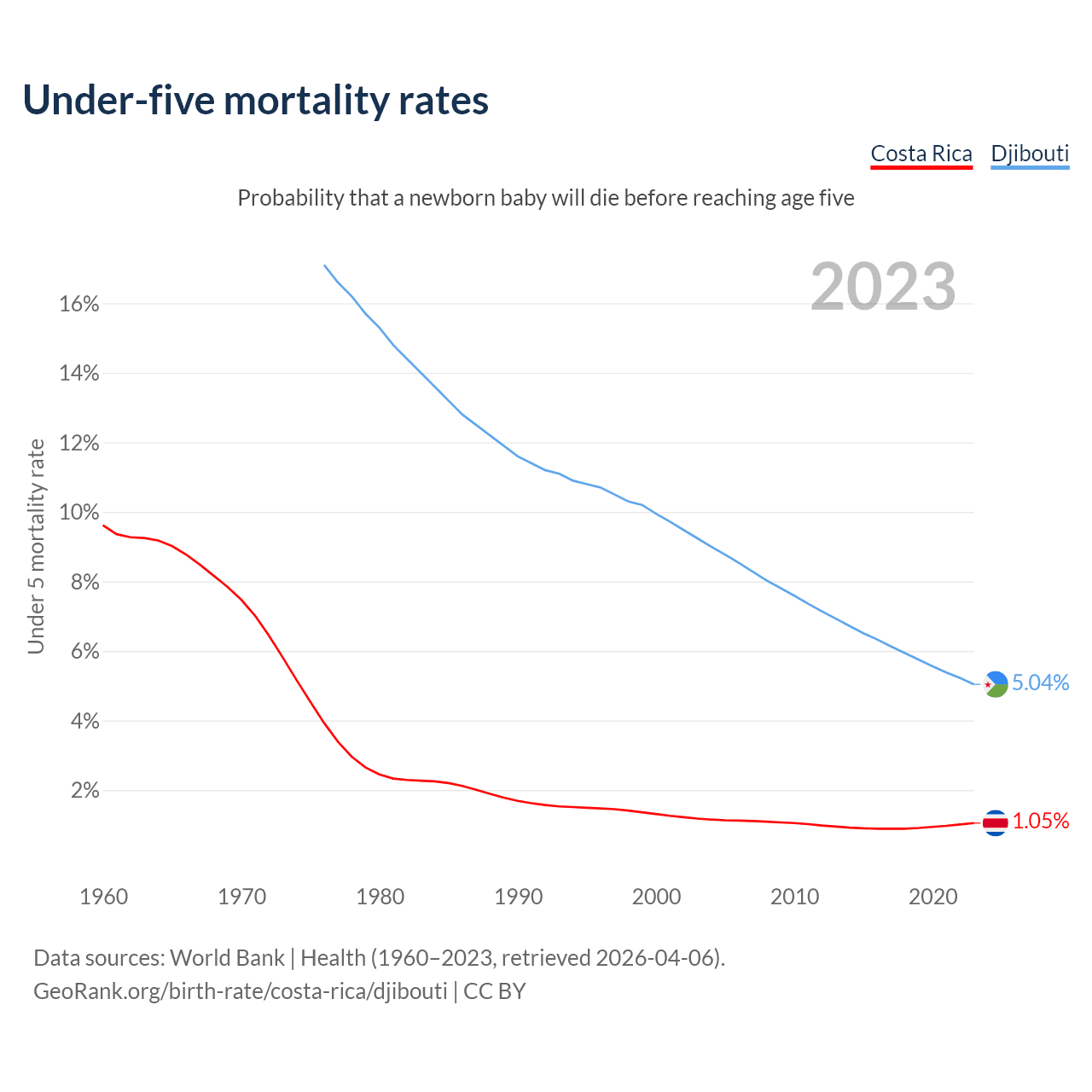 The chance that a newborn baby will die before reaching age five is 1.05% in Costa Rica and 5.04% in Djibouti. Above is a chart with historical data on under-five mortality rates.
