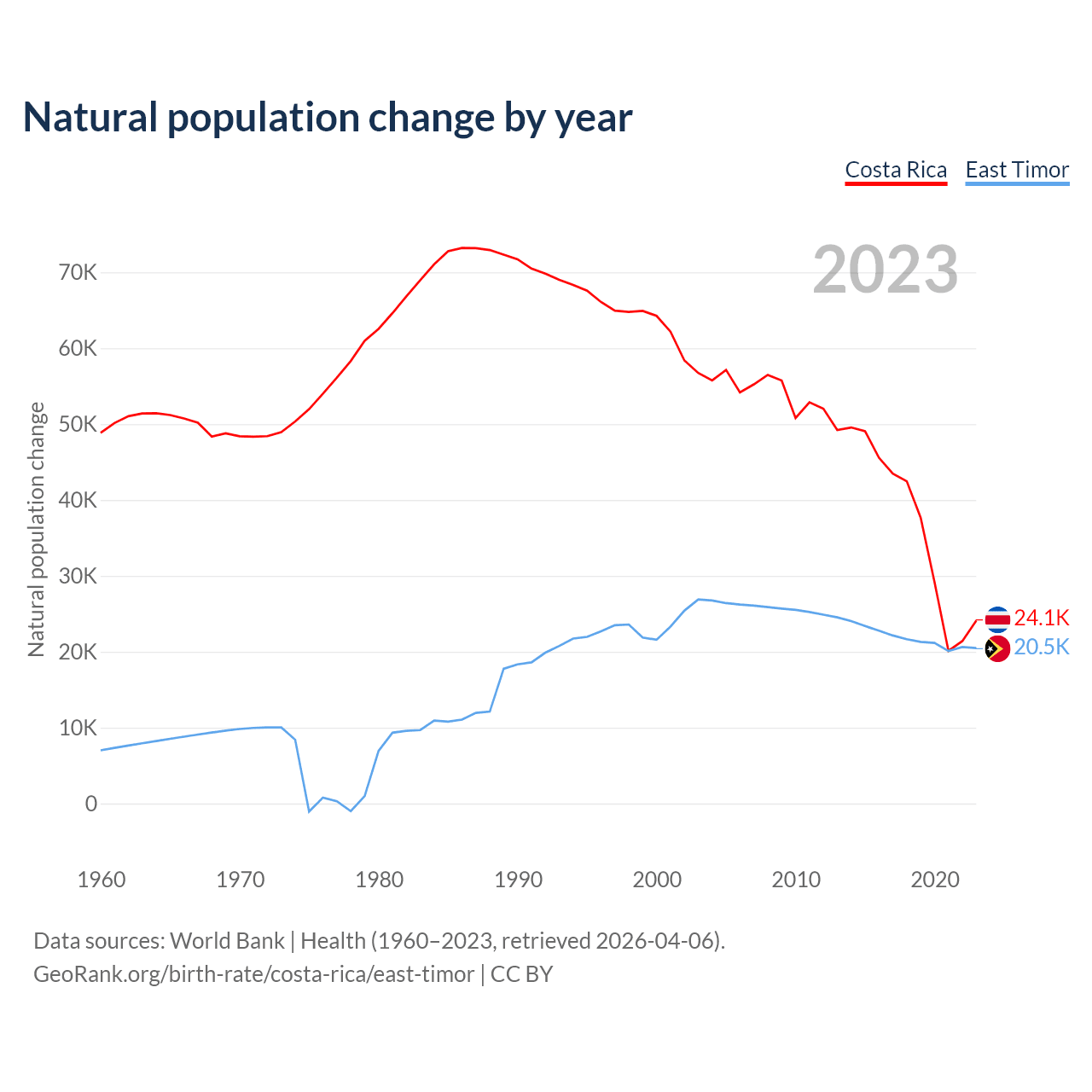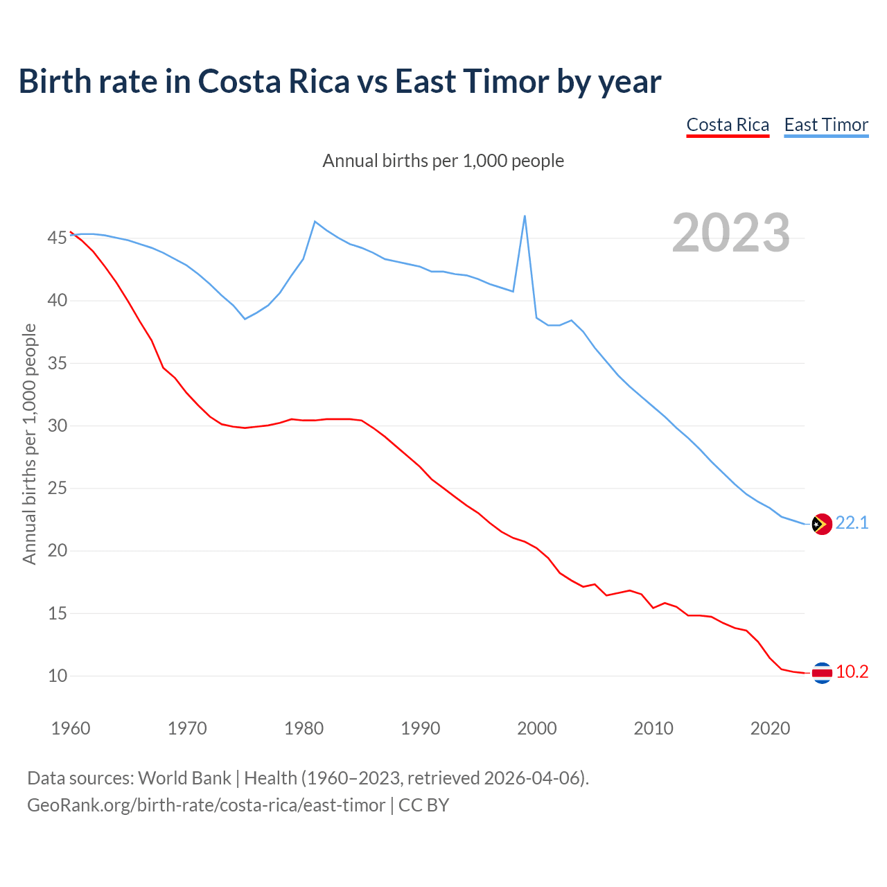 Costa Rica has an annual birth rate of 10.2 births per 1,000 people, compared to 22.1 for East Timor. The average number of children a woman is expected to have during her lifetime — the fertility rate, is 1.33 in Costa Rica and 2.71 in East Timor — 103.5% difference.
