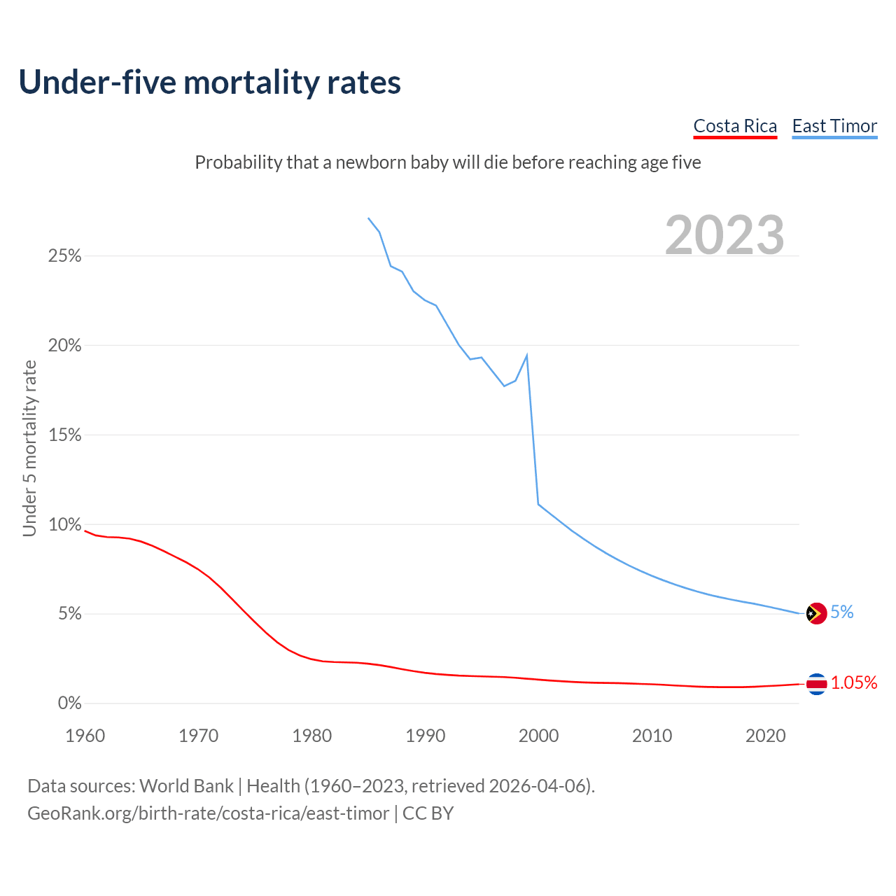 The chance that a newborn baby will die before reaching age five is 1.05% in Costa Rica and 5% in East Timor. Above is a chart with historical data on under-five mortality rates.