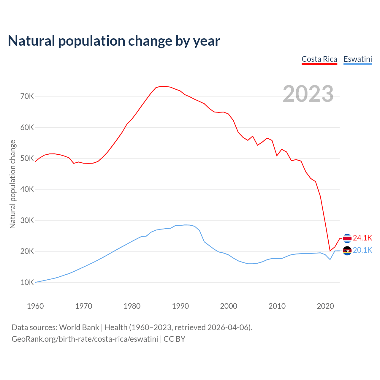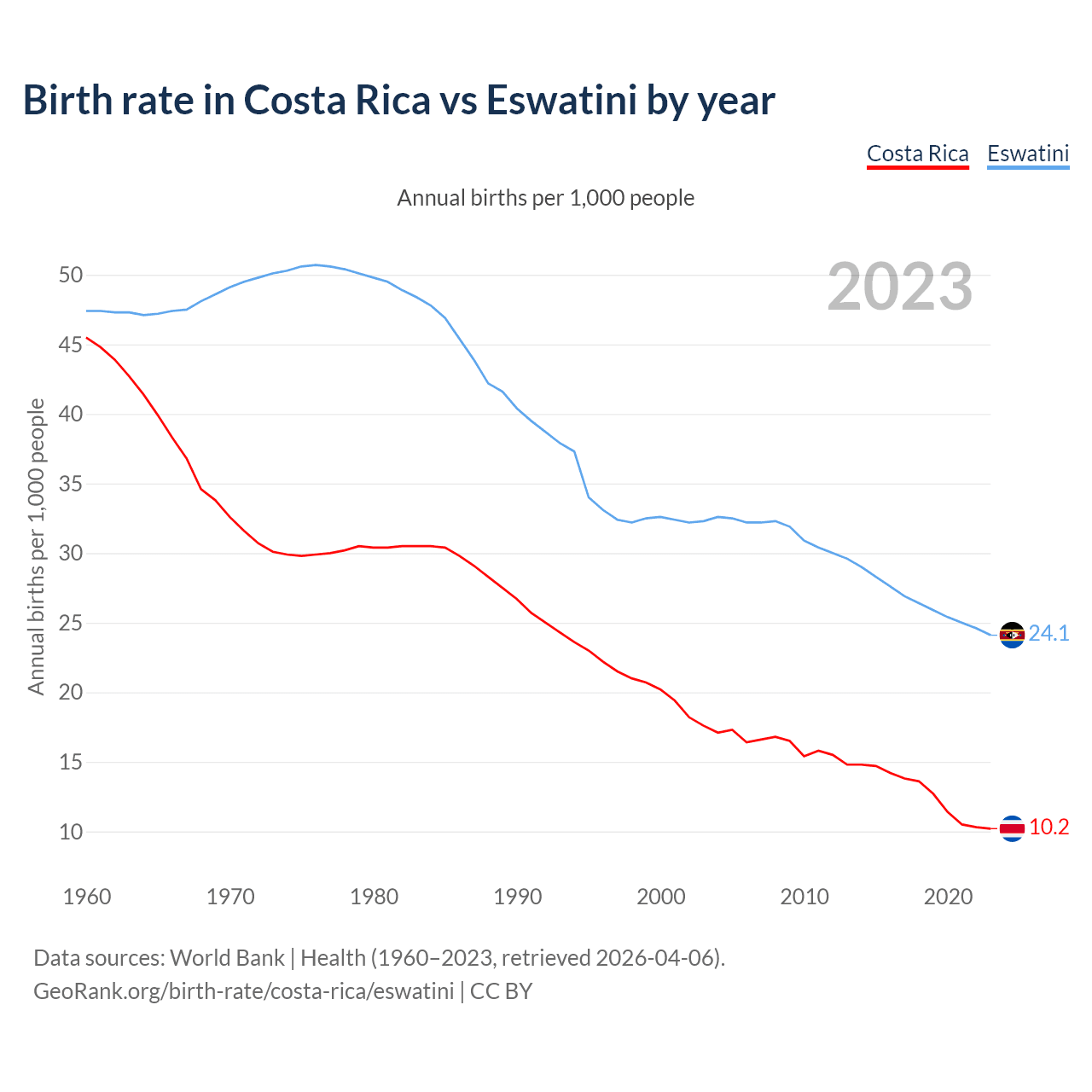 Costa Rica has an annual birth rate of 10.2 births per 1,000 people, compared to 24.1 for Eswatini. The average number of children a woman is expected to have during her lifetime — the fertility rate, is 1.33 in Costa Rica and 2.75 in Eswatini — 107% difference.