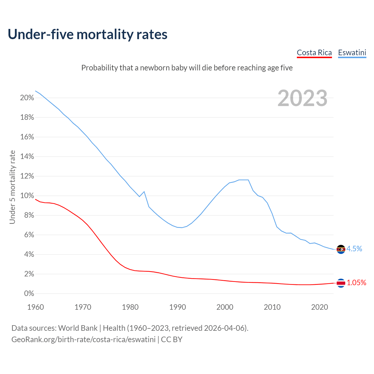 The chance that a newborn baby will die before reaching age five is 1.05% in Costa Rica and 4.5% in Eswatini. Above is a chart with historical data on under-five mortality rates.