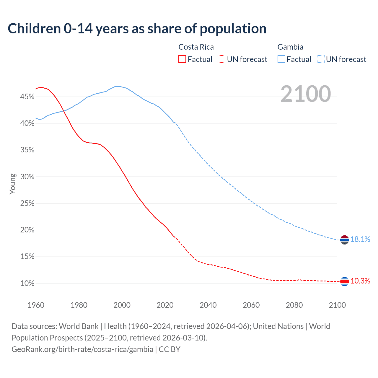 Costa Rica has an annual birth rate of 10.2 births per 1,000 people, compared to 30.4 for the Gambia. The average number of children a woman is expected to have during her lifetime — the fertility rate, is 1.33 in Costa Rica and 4.01 in the Gambia — 201.2% difference.
