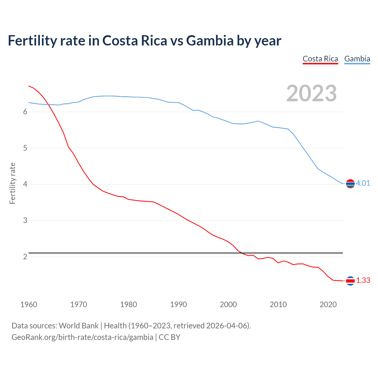 According to the latest available data on birth rates, the fertility rate in Costa Rica was 1.33 children per woman in 2023, compared to 4.01 in the Gambia in 2023. The replacement level is considered to be 2.1 children per woman.