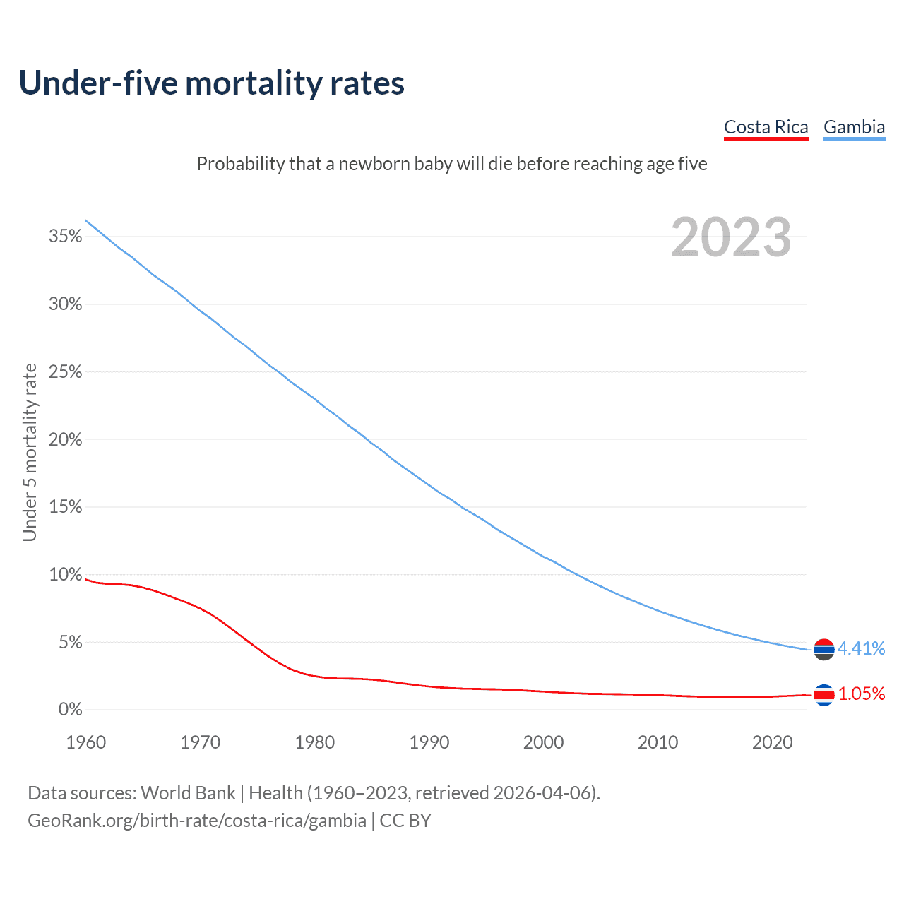 The chance that a newborn baby will die before reaching age five is 1.05% in Costa Rica and 4.41% in the Gambia. Above is a chart with historical data on under-five mortality rates.