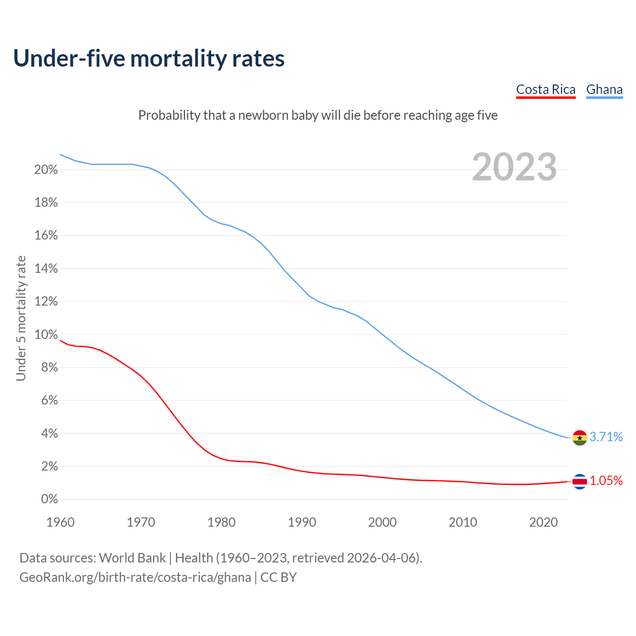The chance that a newborn baby will die before reaching age five is 1.05% in Costa Rica and 3.71% in Ghana. Above is a chart with historical data on under-five mortality rates.