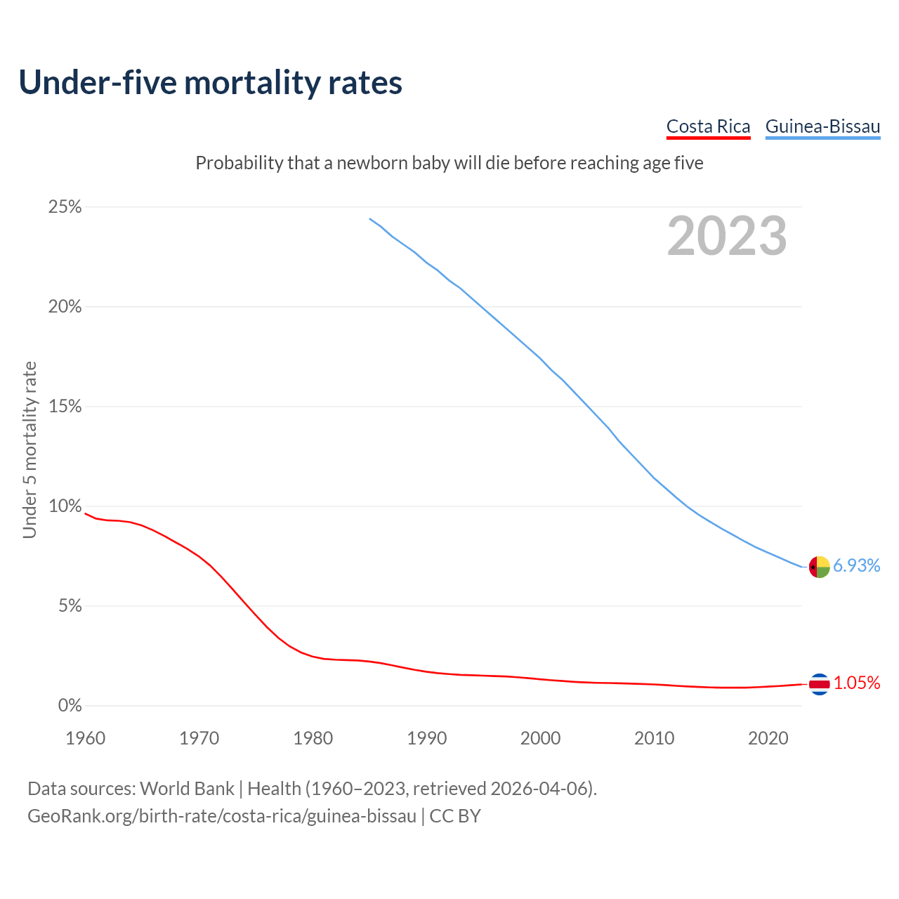 The chance that a newborn baby will die before reaching age five is 1.05% in Costa Rica and 6.93% in Guinea-Bissau. Above is a chart with historical data on under-five mortality rates.