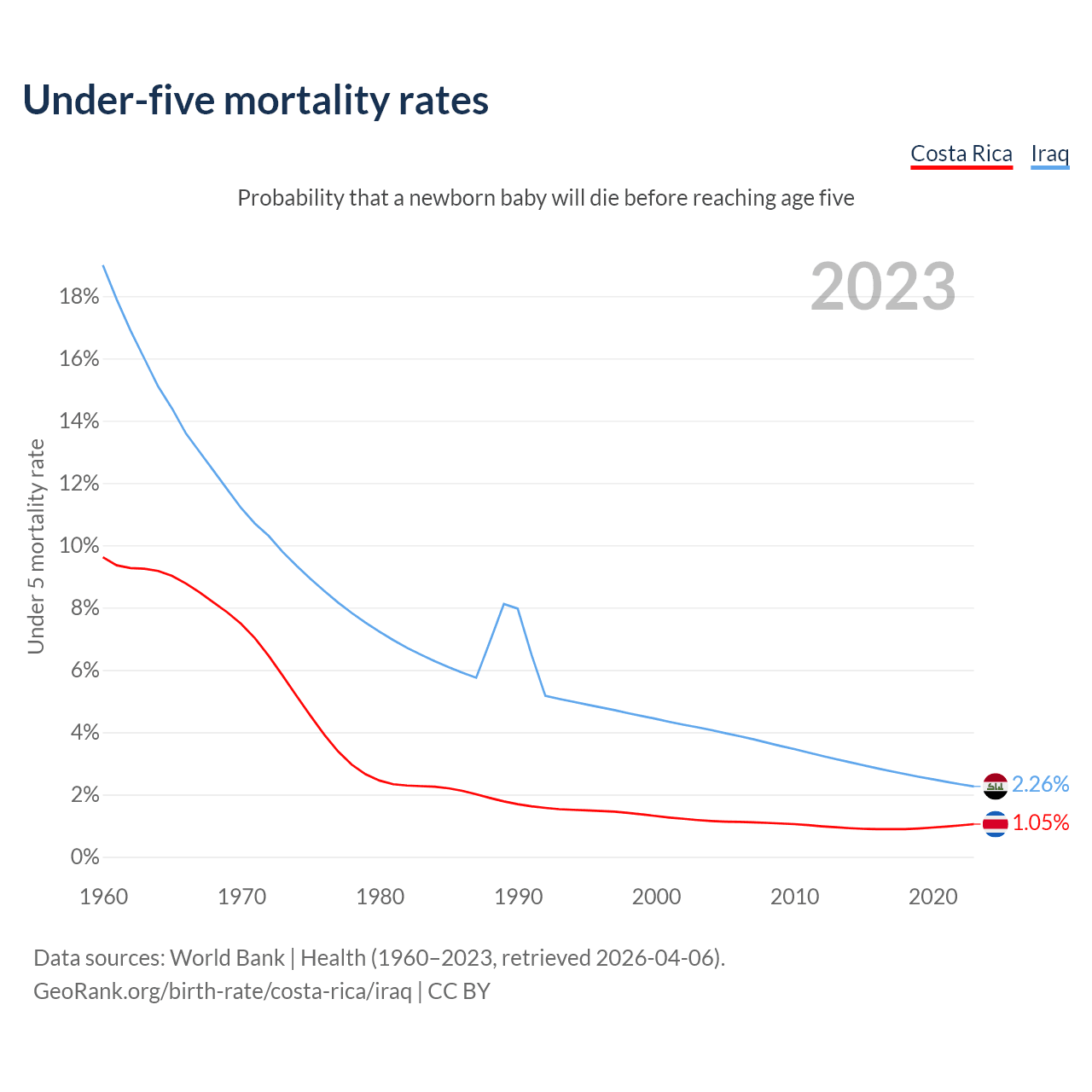 The chance that a newborn baby will die before reaching age five is 1.05% in Costa Rica and 2.26% in Iraq. Above is a chart with historical data on under-five mortality rates.