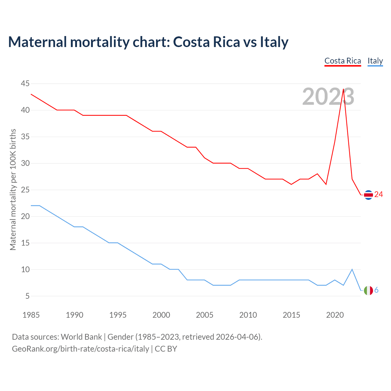 The maternal mortality rate, which is the probability of dying during childbirth or within 42 days of pregnancy termination, is 24 deaths per 100,000 live births in Costa Rica, compared to 6 deaths in Italy.