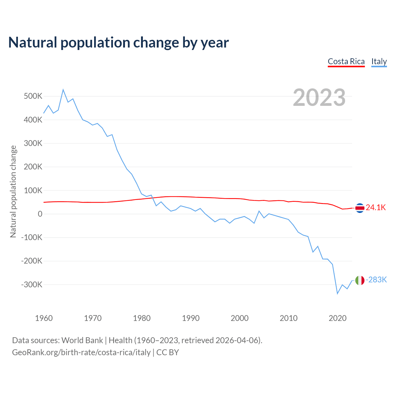 According to the latest available data on birth rates, the fertility rate in Costa Rica was 1.33 children per woman in 2023, compared to 1.2 in Italy in 2023. The replacement level is considered to be 2.1 children per woman.