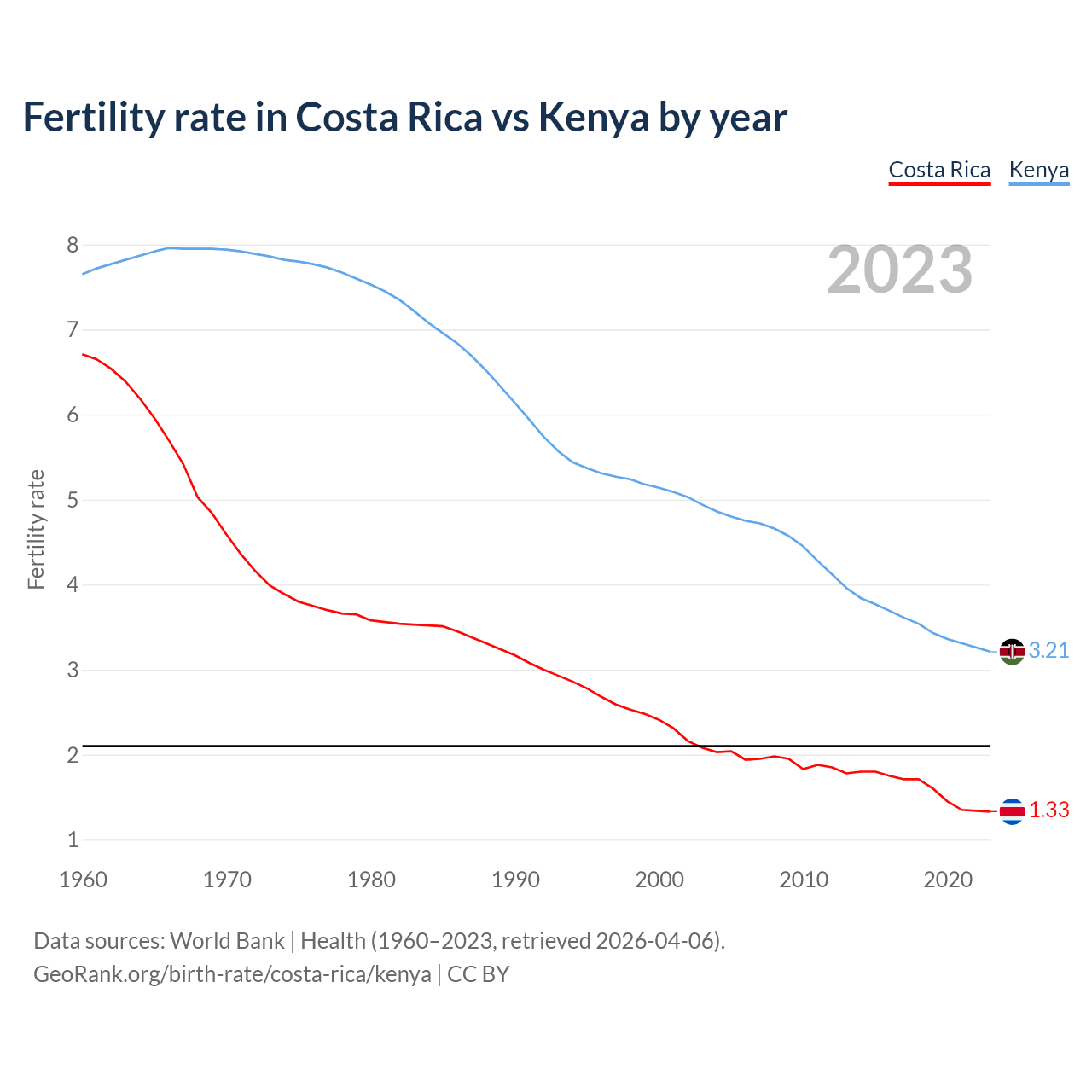 According to the latest available data on birth rates, the fertility rate in Costa Rica was 1.33 children per woman in 2023, compared to 3.21 in Kenya in 2023. The replacement level is considered to be 2.1 children per woman.