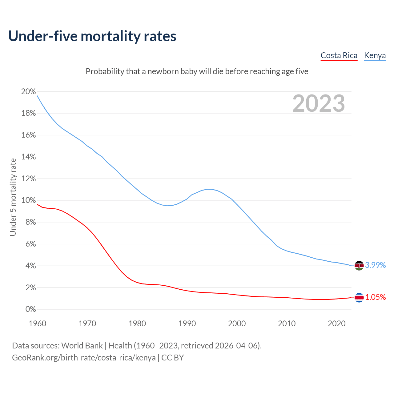 The chance that a newborn baby will die before reaching age five is 1.05% in Costa Rica and 3.99% in Kenya. Above is a chart with historical data on under-five mortality rates.