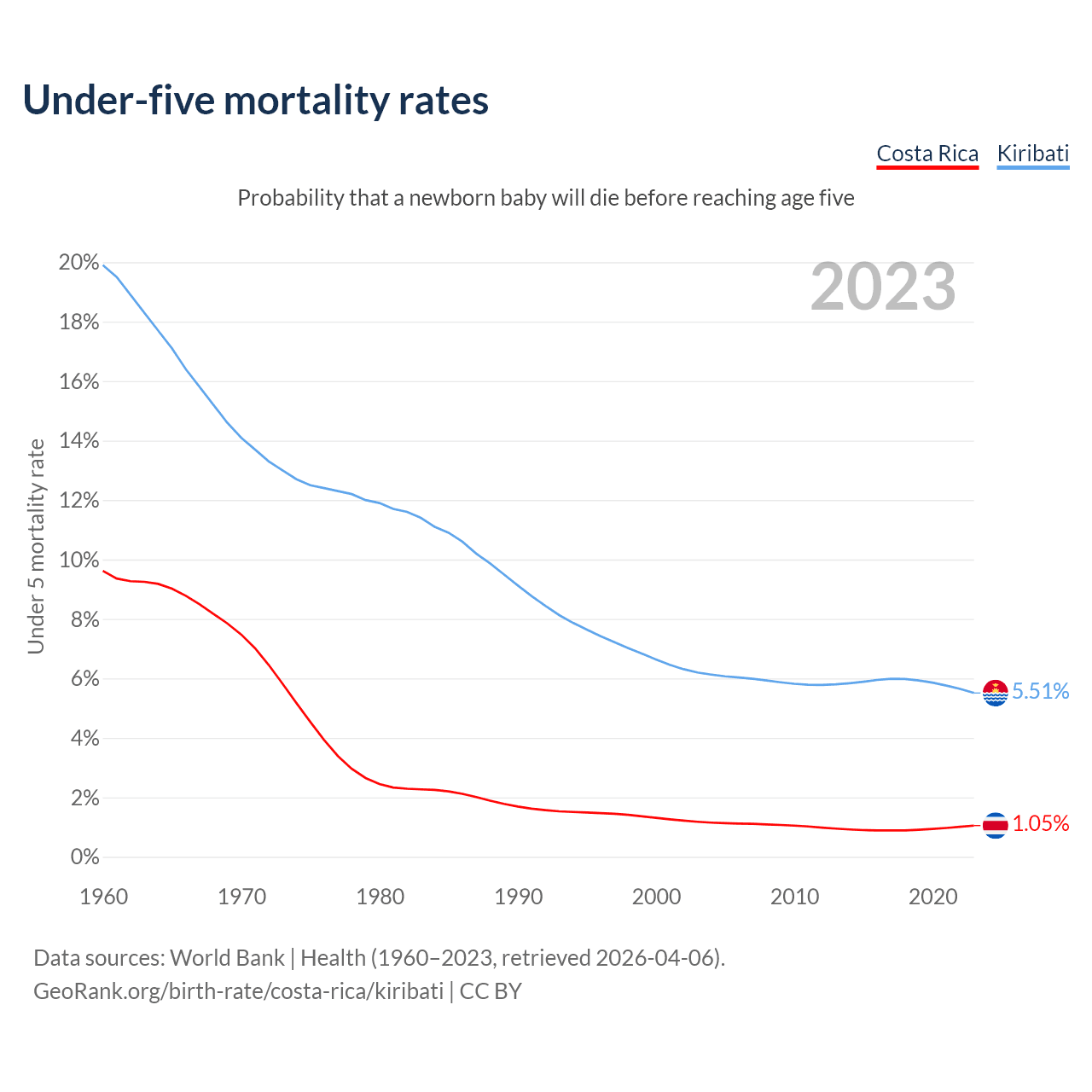 The chance that a newborn baby will die before reaching age five is 1.05% in Costa Rica and 5.51% in Kiribati. Above is a chart with historical data on under-five mortality rates.