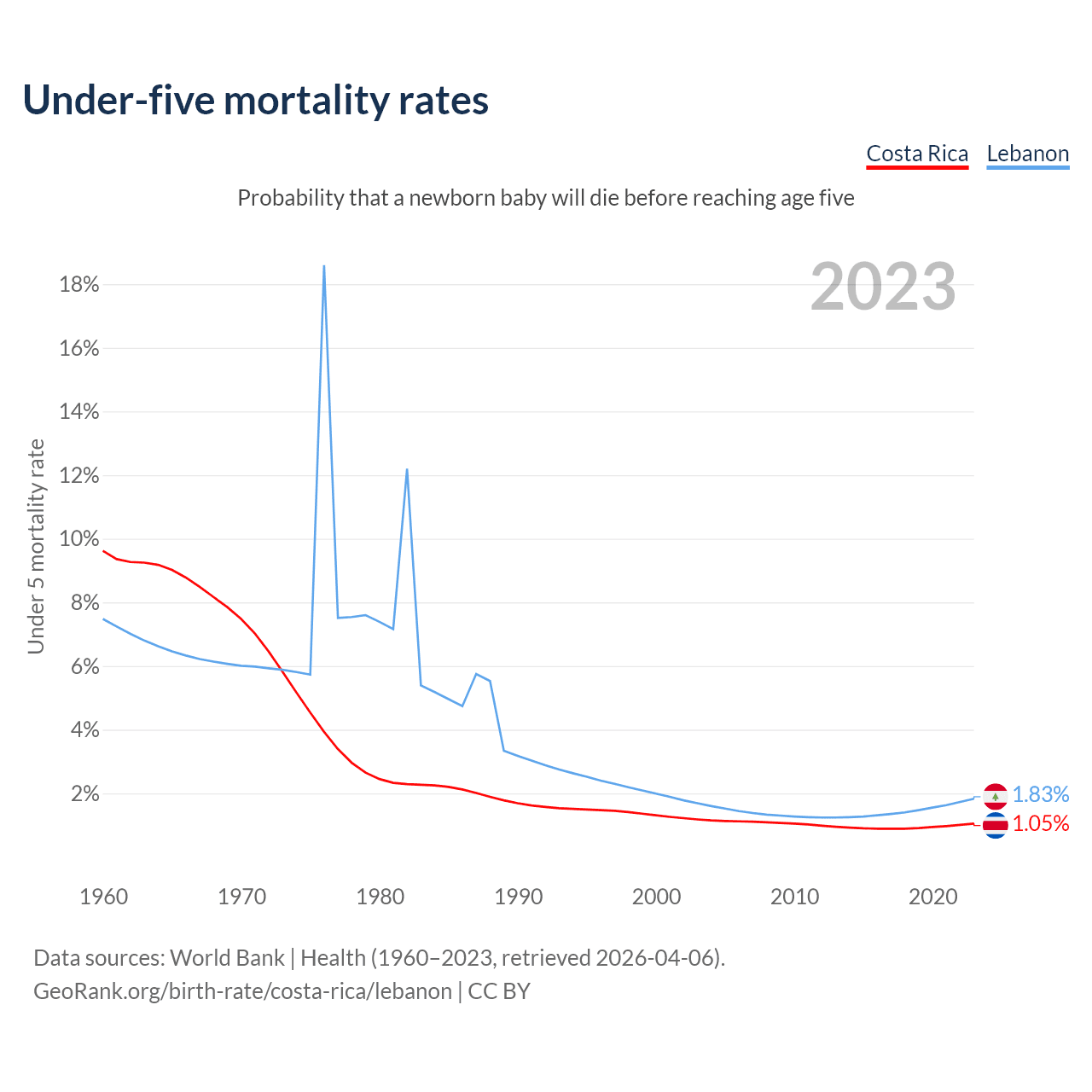 The chance that a newborn baby will die before reaching age five is 1.05% in Costa Rica and 1.83% in Lebanon. Above is a chart with historical data on under-five mortality rates.