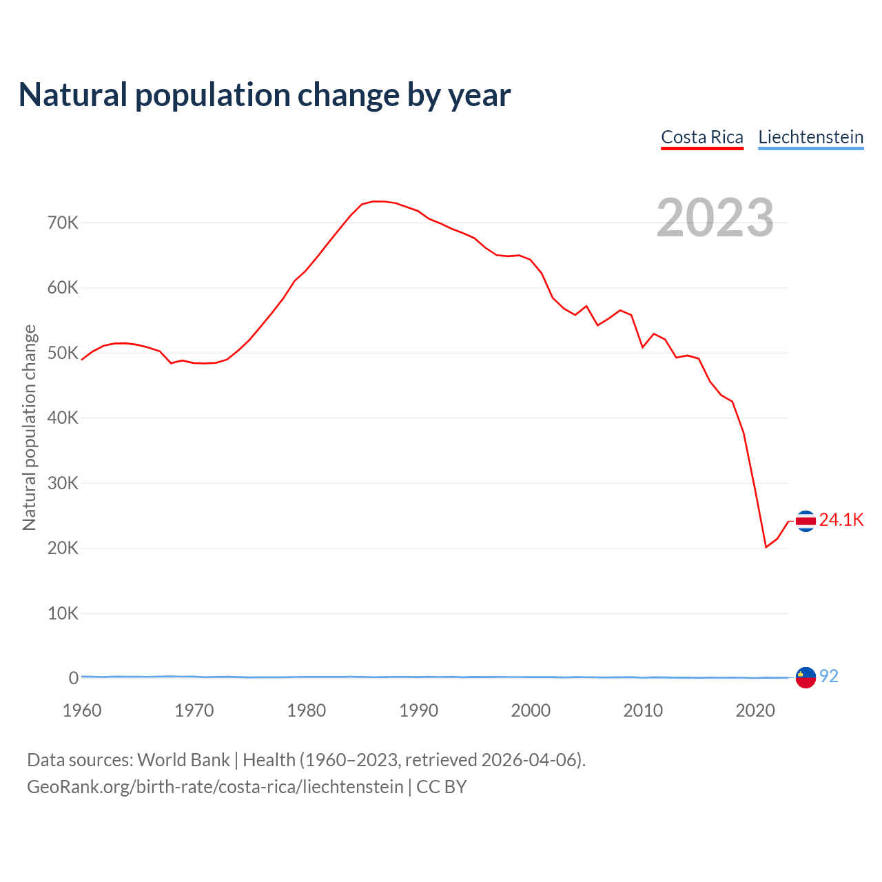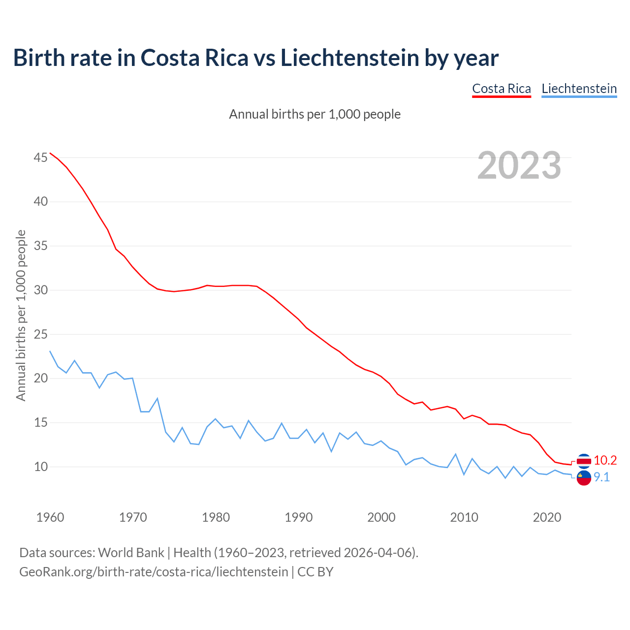 According to the latest available data on birth rates, the fertility rate in Costa Rica was 1.33 children per woman in 2023, compared to 1.45 in Liechtenstein in 2023. The replacement level is considered to be 2.1 children per woman.