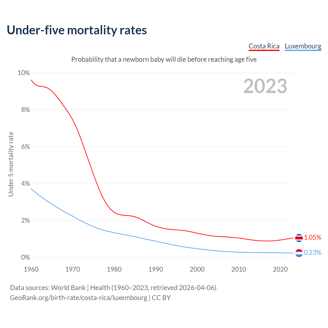 The chance that a newborn baby will die before reaching age five is 1.05% in Costa Rica and 0.23% in Luxembourg. Above is a chart with historical data on under-five mortality rates.