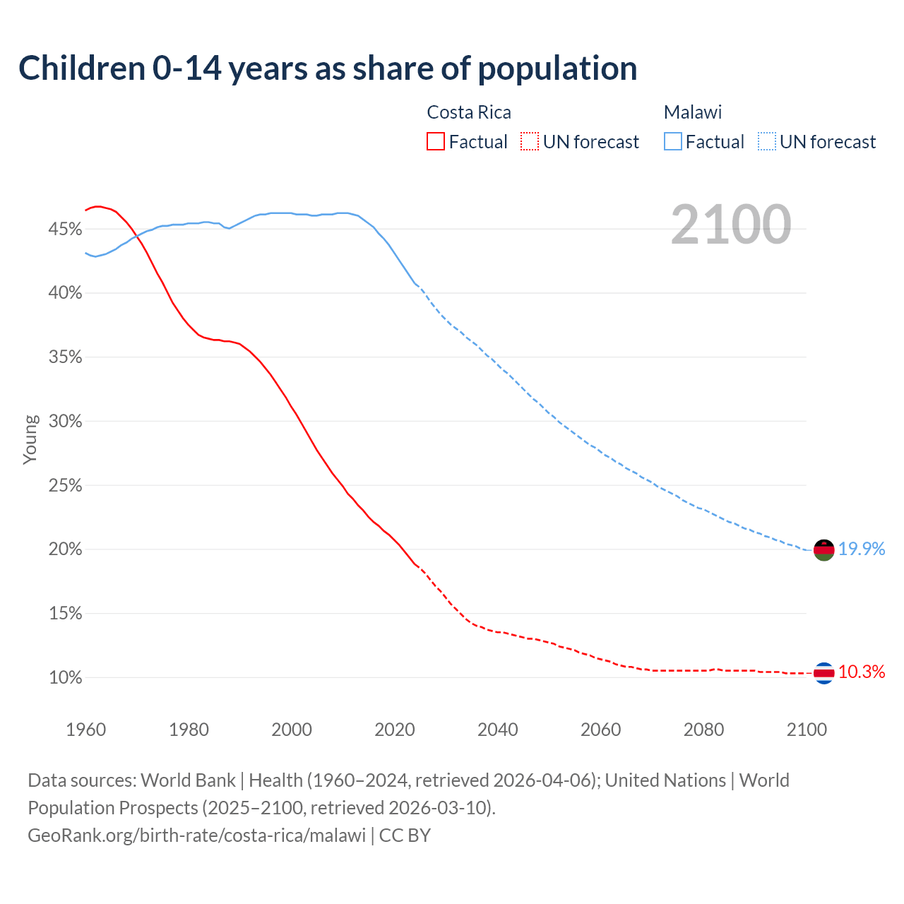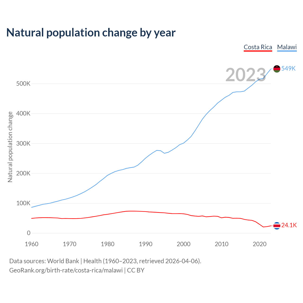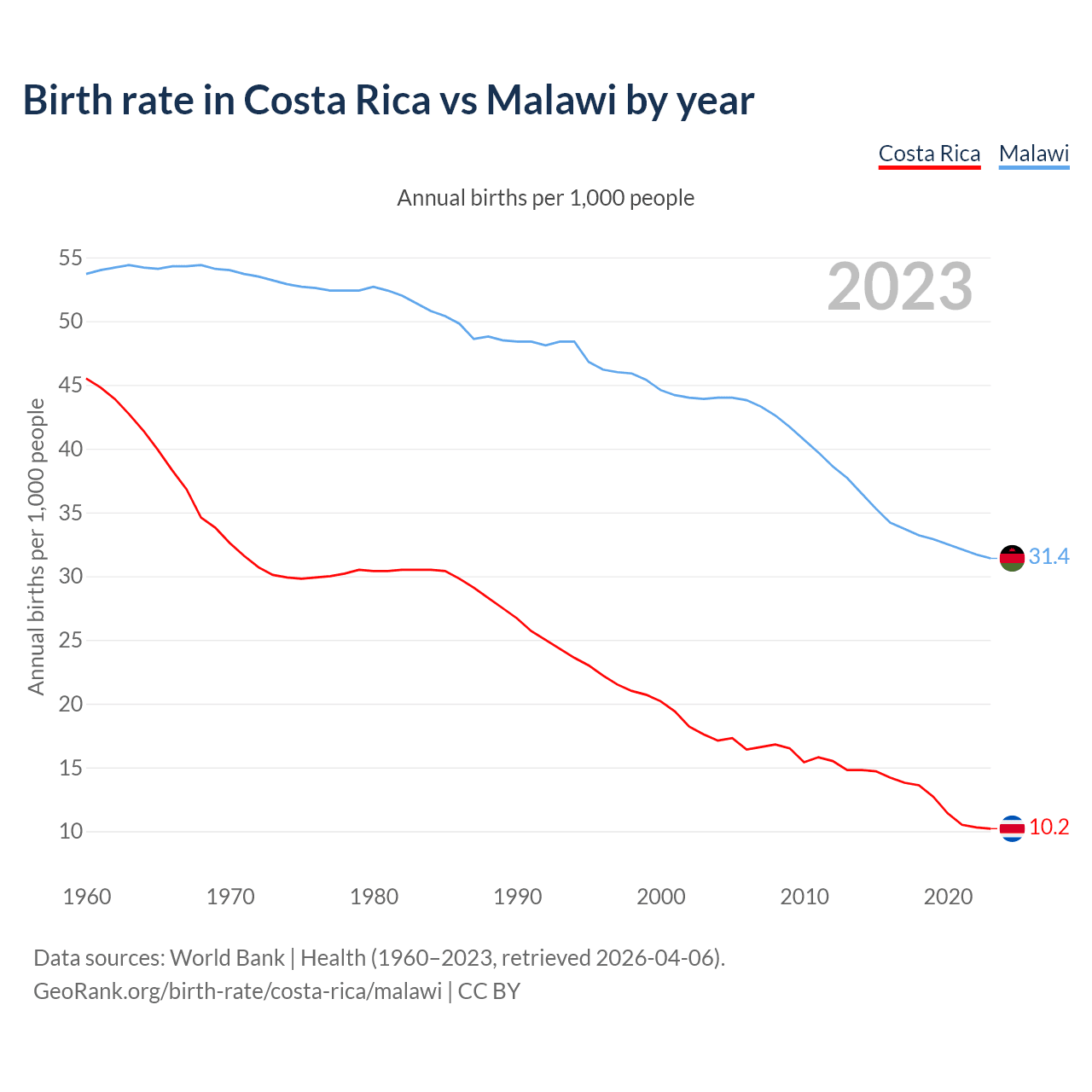 Costa Rica has an annual birth rate of 10.2 births per 1,000 people, compared to 31.4 for Malawi. The average number of children a woman is expected to have during her lifetime — the fertility rate, is 1.33 in Costa Rica and 3.65 in Malawi — 174.3% difference.