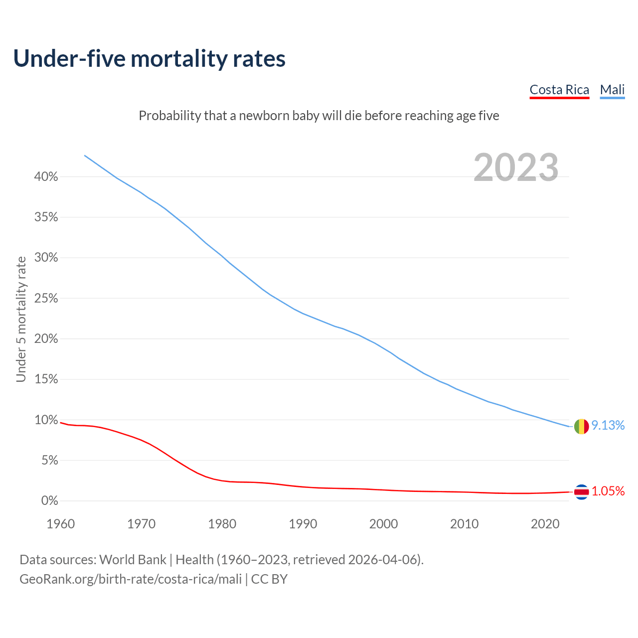 The chance that a newborn baby will die before reaching age five is 1.05% in Costa Rica and 9.13% in Mali. Above is a chart with historical data on under-five mortality rates.