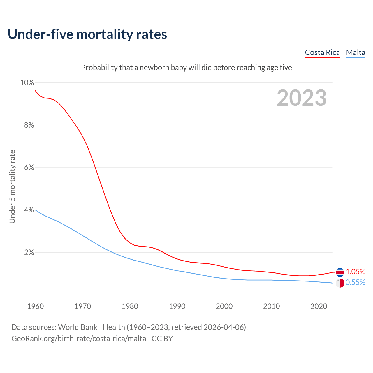 The chance that a newborn baby will die before reaching age five is 1.05% in Costa Rica and 0.55% in Malta. Above is a chart with historical data on under-five mortality rates.