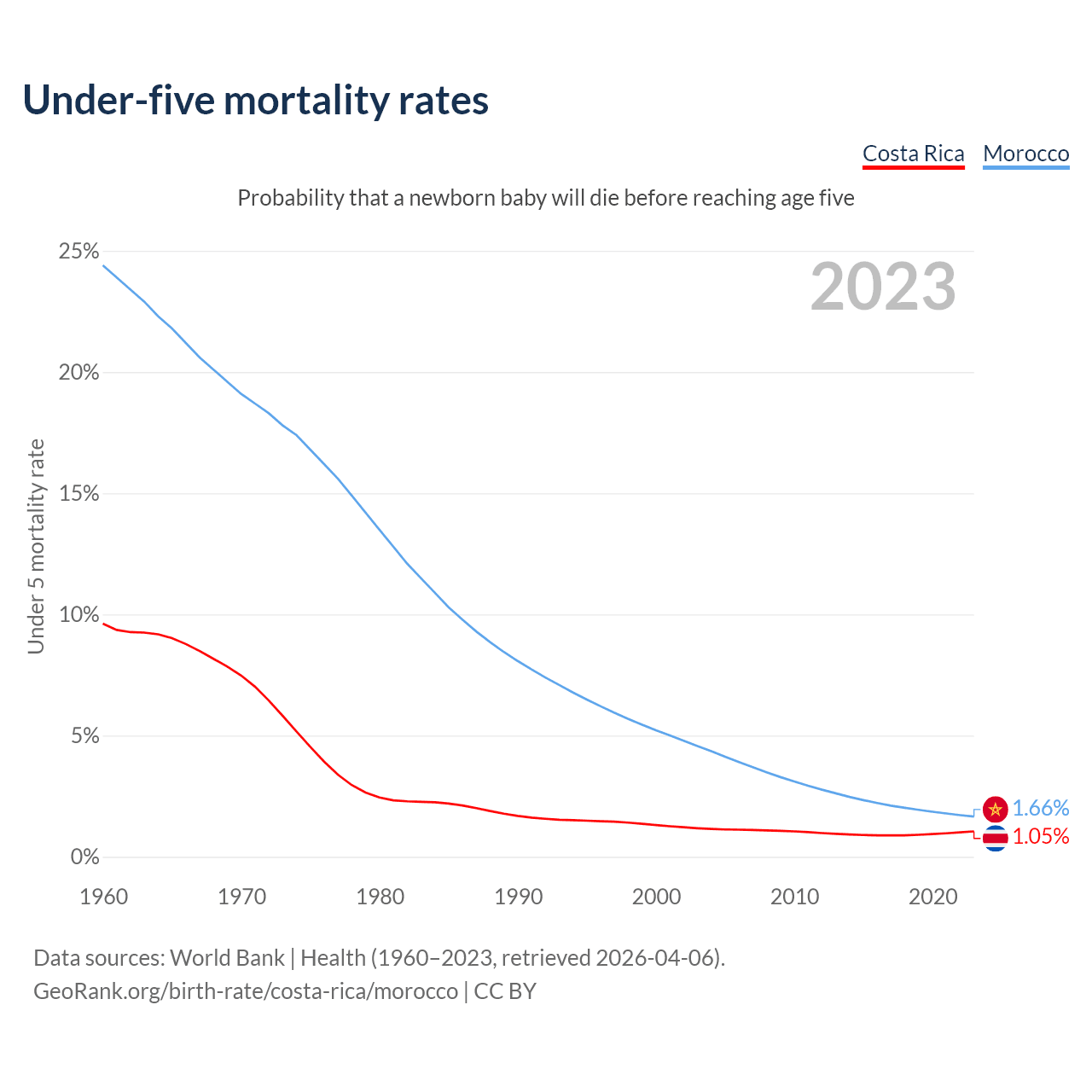 The chance that a newborn baby will die before reaching age five is 1.05% in Costa Rica and 1.66% in Morocco. Above is a chart with historical data on under-five mortality rates.