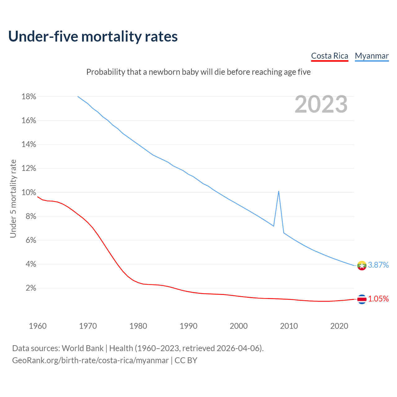 The chance that a newborn baby will die before reaching age five is 1.05% in Costa Rica and 3.87% in Myanmar. Above is a chart with historical data on under-five mortality rates.