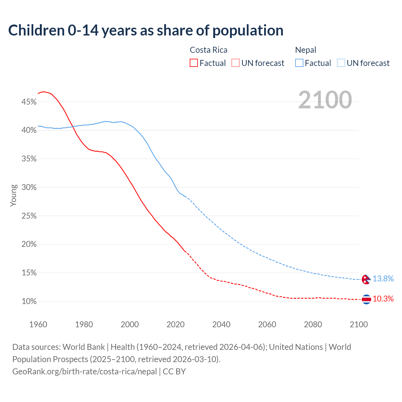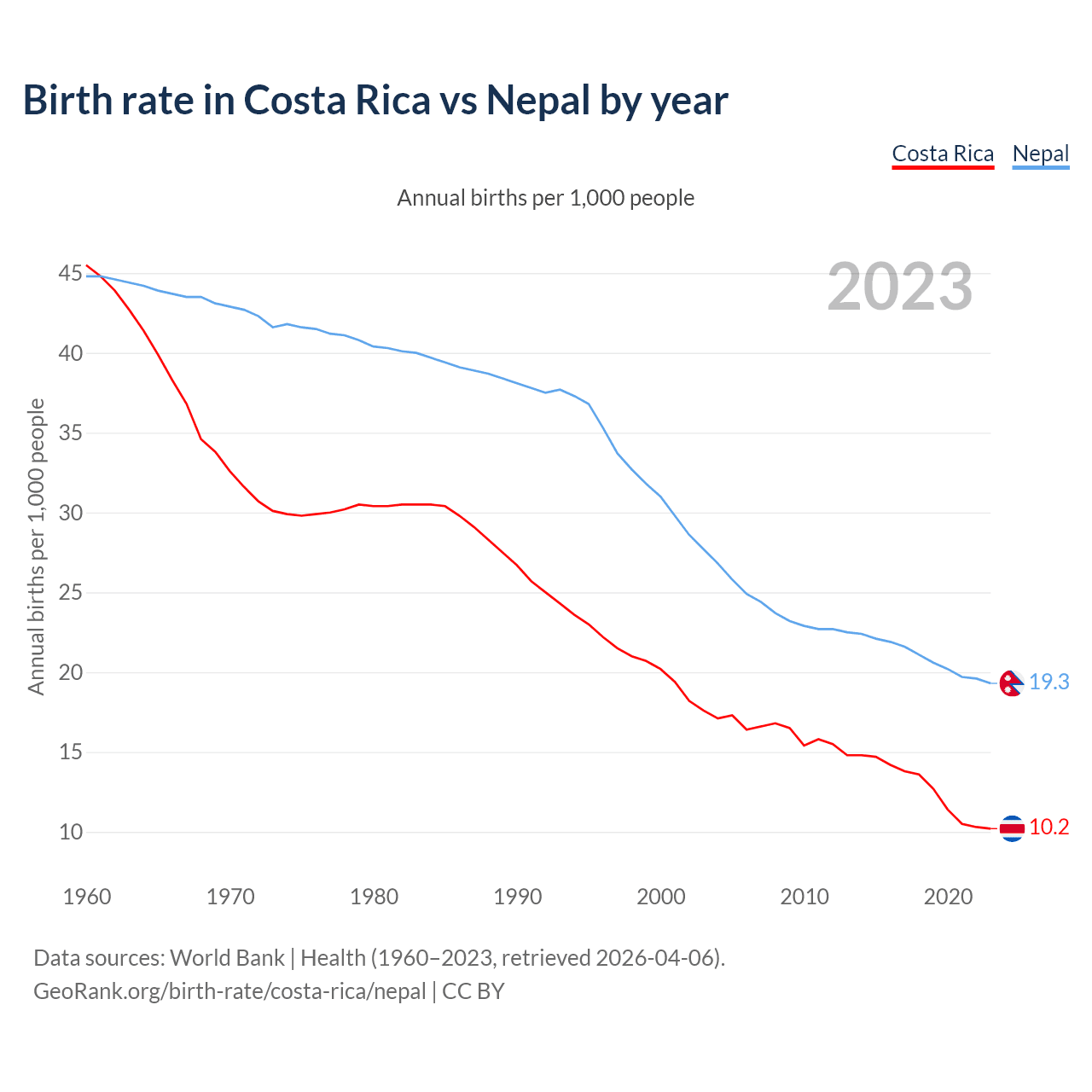 Costa Rica has an annual birth rate of 10.2 births per 1,000 people, compared to 19.3 for Nepal. The average number of children a woman is expected to have during her lifetime — the fertility rate, is 1.33 in Costa Rica and 1.98 in Nepal — 49.2% difference.