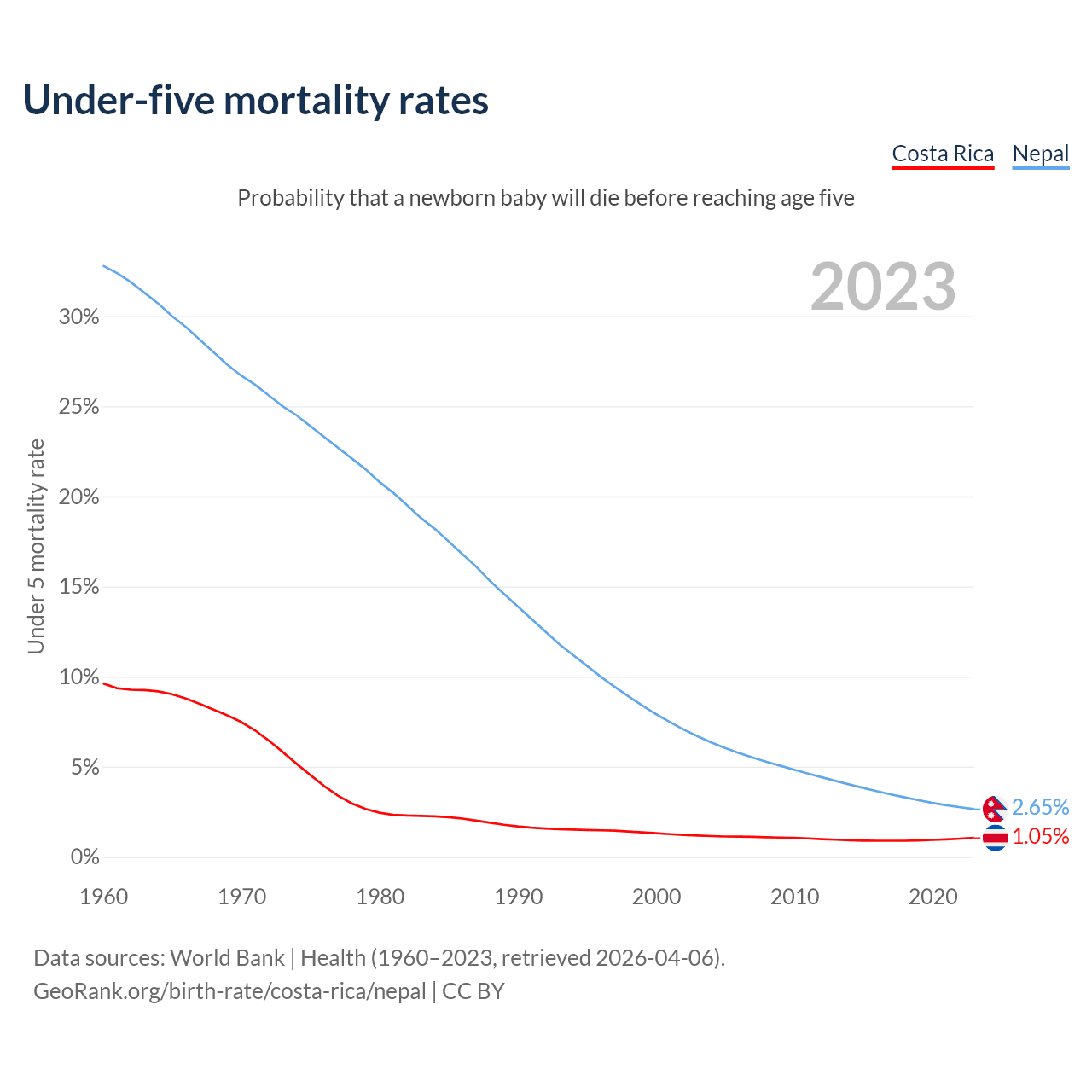 The chance that a newborn baby will die before reaching age five is 1.05% in Costa Rica and 2.65% in Nepal. Above is a chart with historical data on under-five mortality rates.