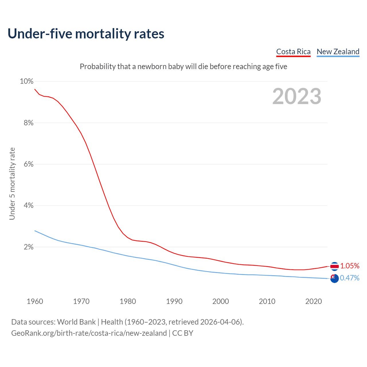 The chance that a newborn baby will die before reaching age five is 1.05% in Costa Rica and 0.47% in New Zealand. Above is a chart with historical data on under-five mortality rates.