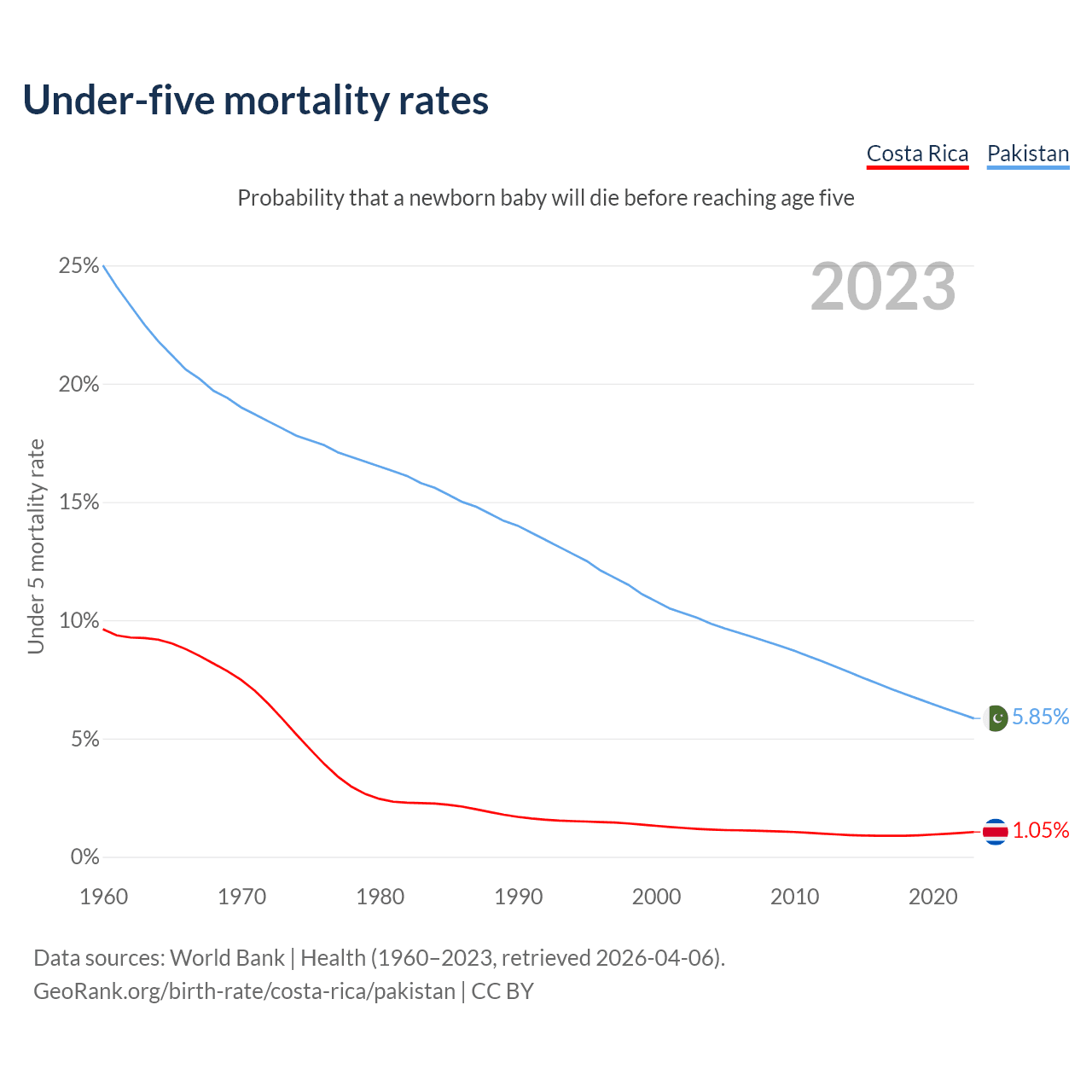 The chance that a newborn baby will die before reaching age five is 1.05% in Costa Rica and 5.85% in Pakistan. Above is a chart with historical data on under-five mortality rates.