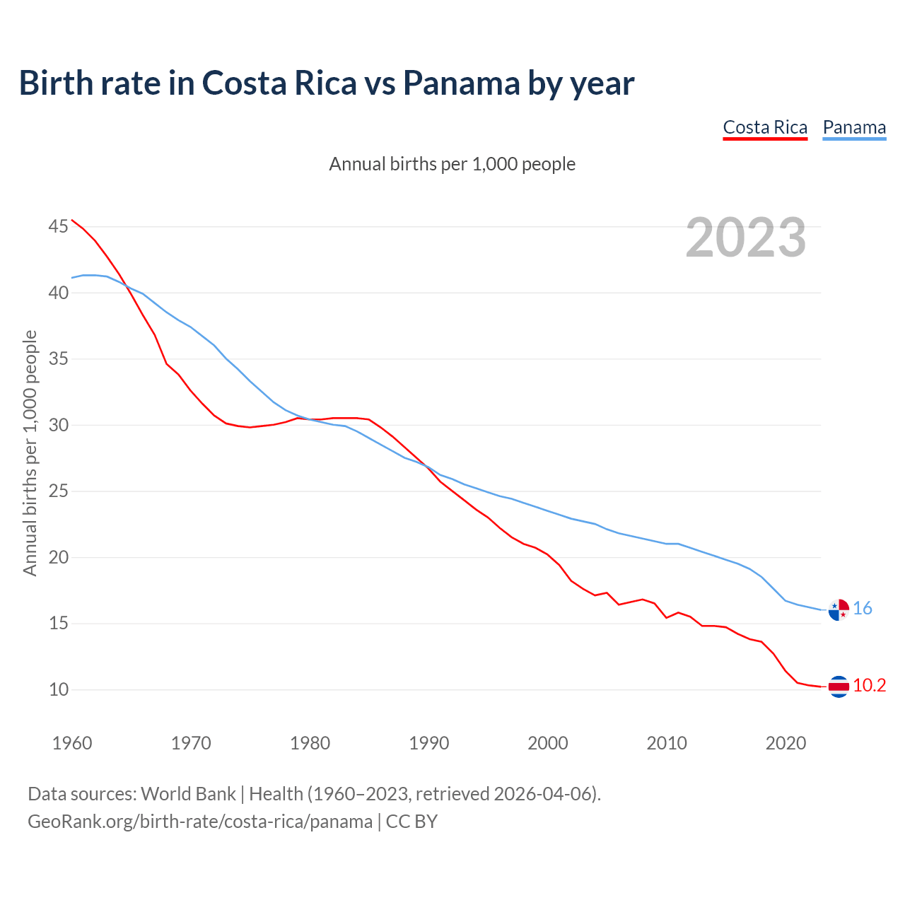 Costa Rica has an annual birth rate of 10.2 births per 1,000 people, compared to 16 for Panama. The average number of children a woman is expected to have during her lifetime — the fertility rate, is 1.33 in Costa Rica and 2.12 in Panama — 59.3% difference.