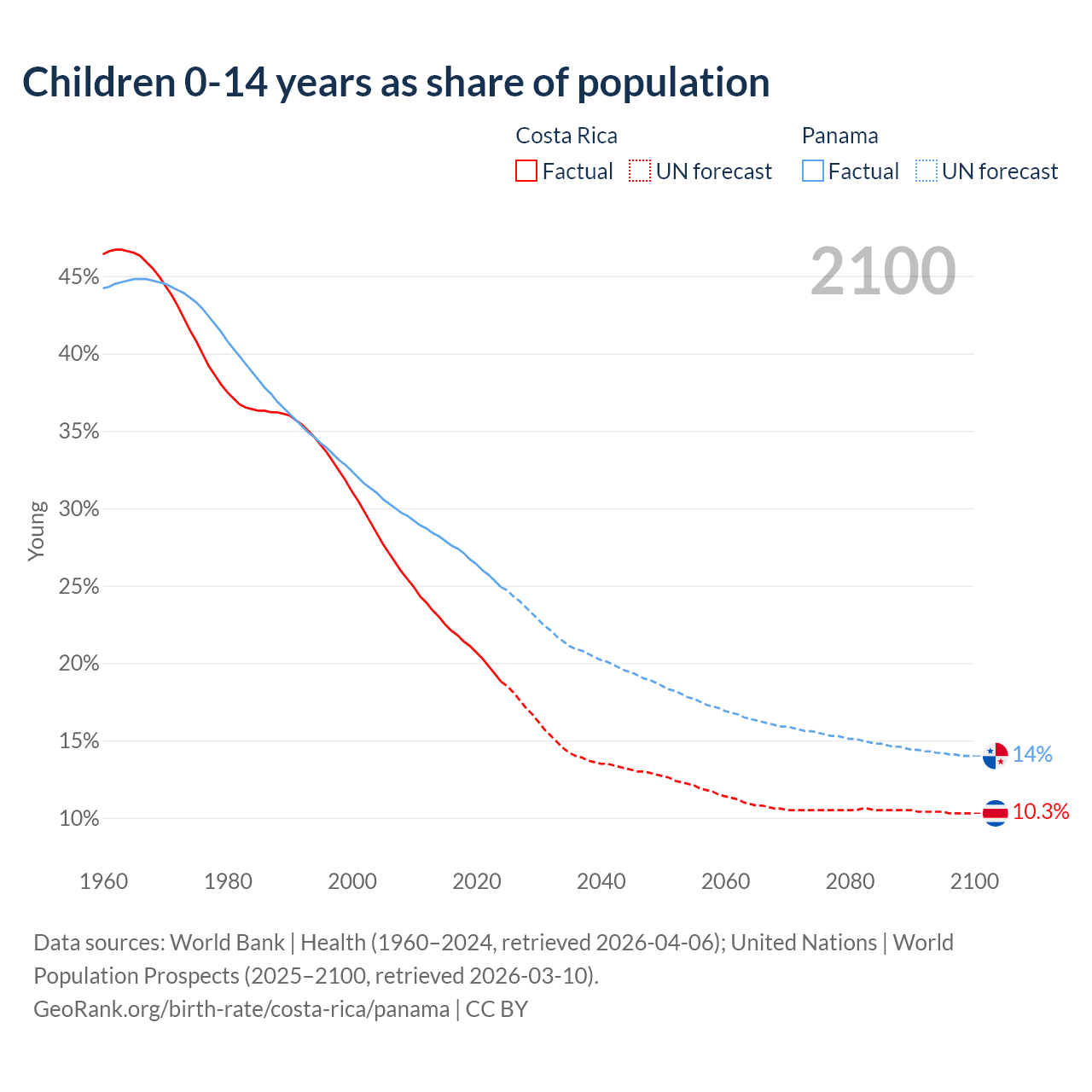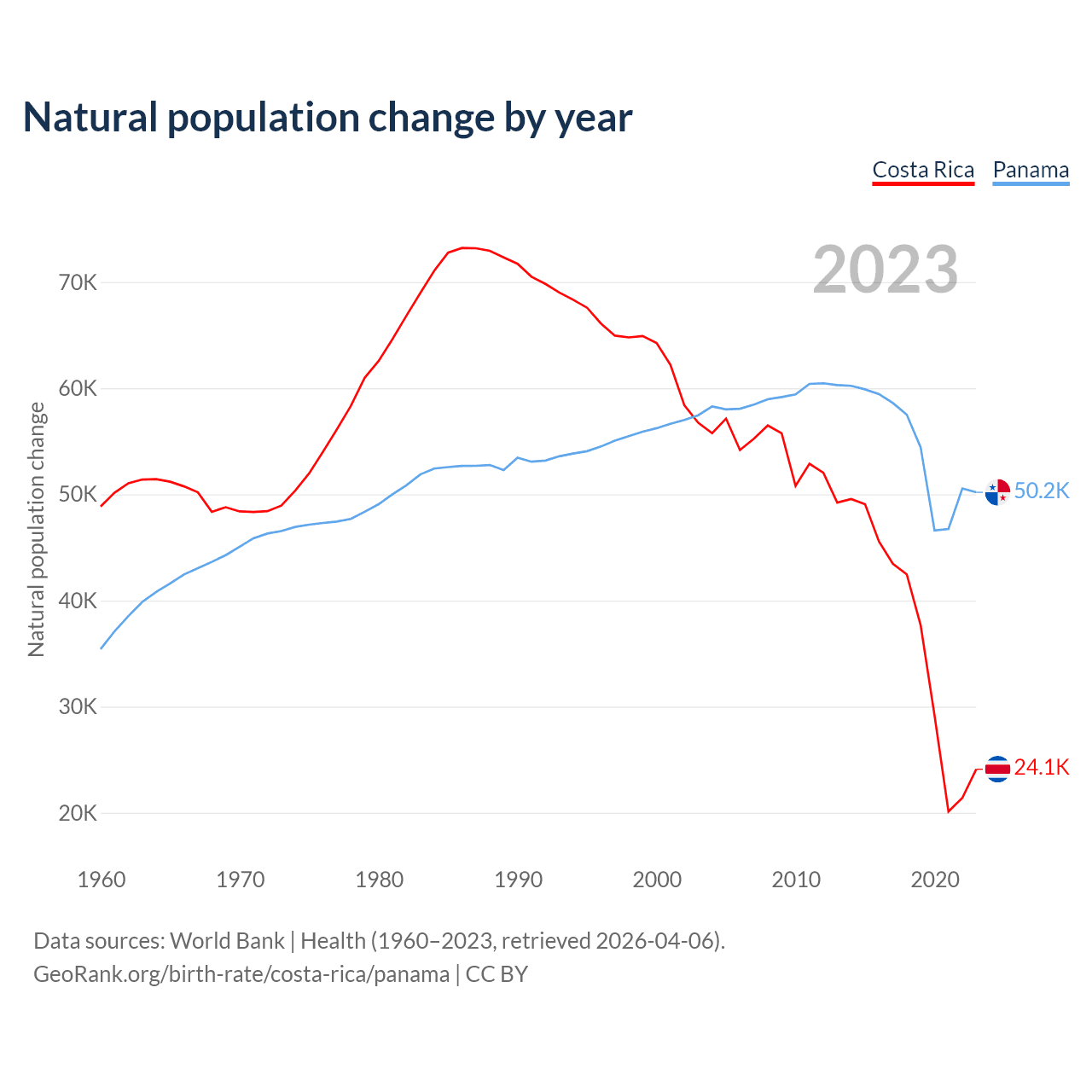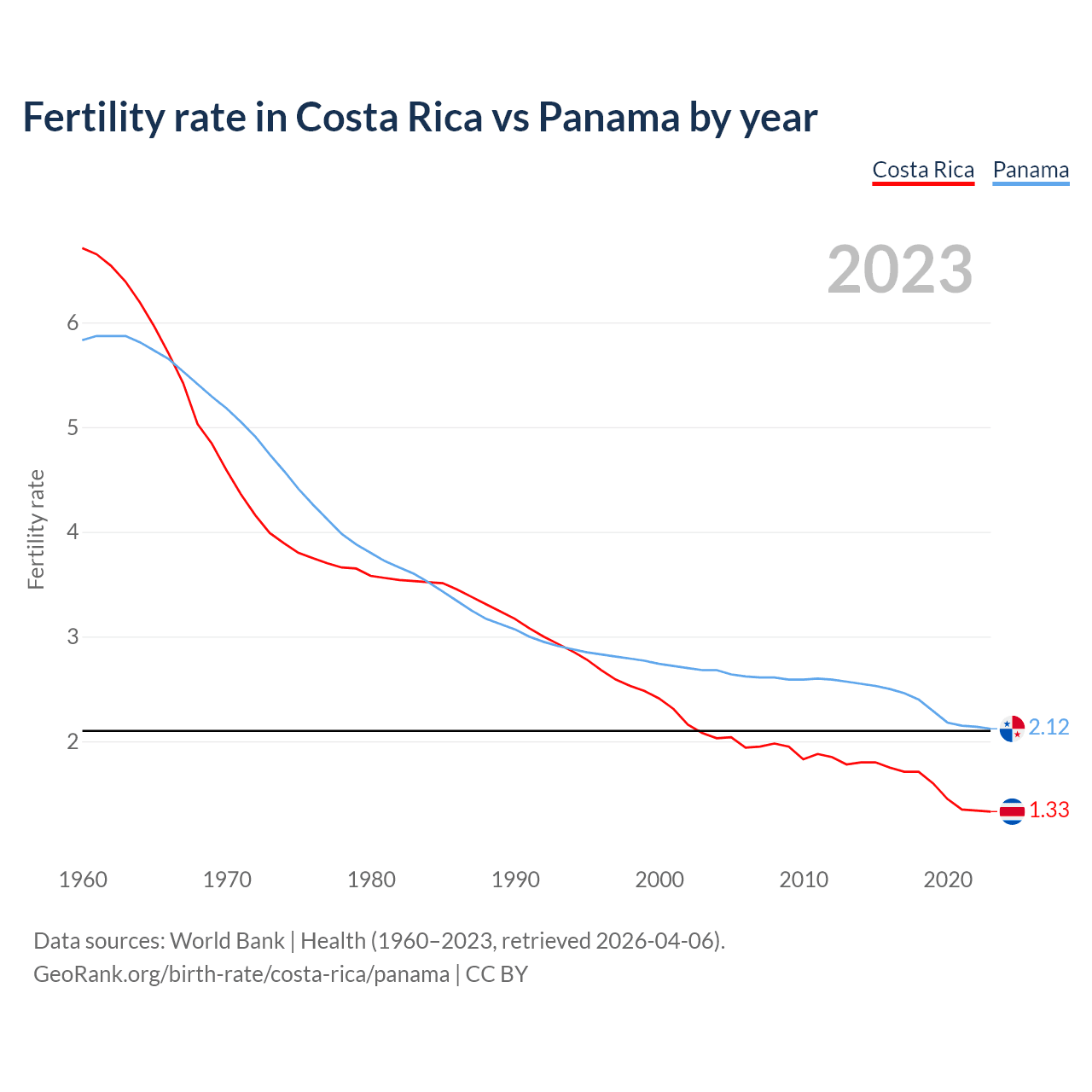 According to the latest available data on birth rates, the fertility rate in Costa Rica was 1.33 children per woman in 2023, compared to 2.12 in Panama in 2023. The replacement level is considered to be 2.1 children per woman.